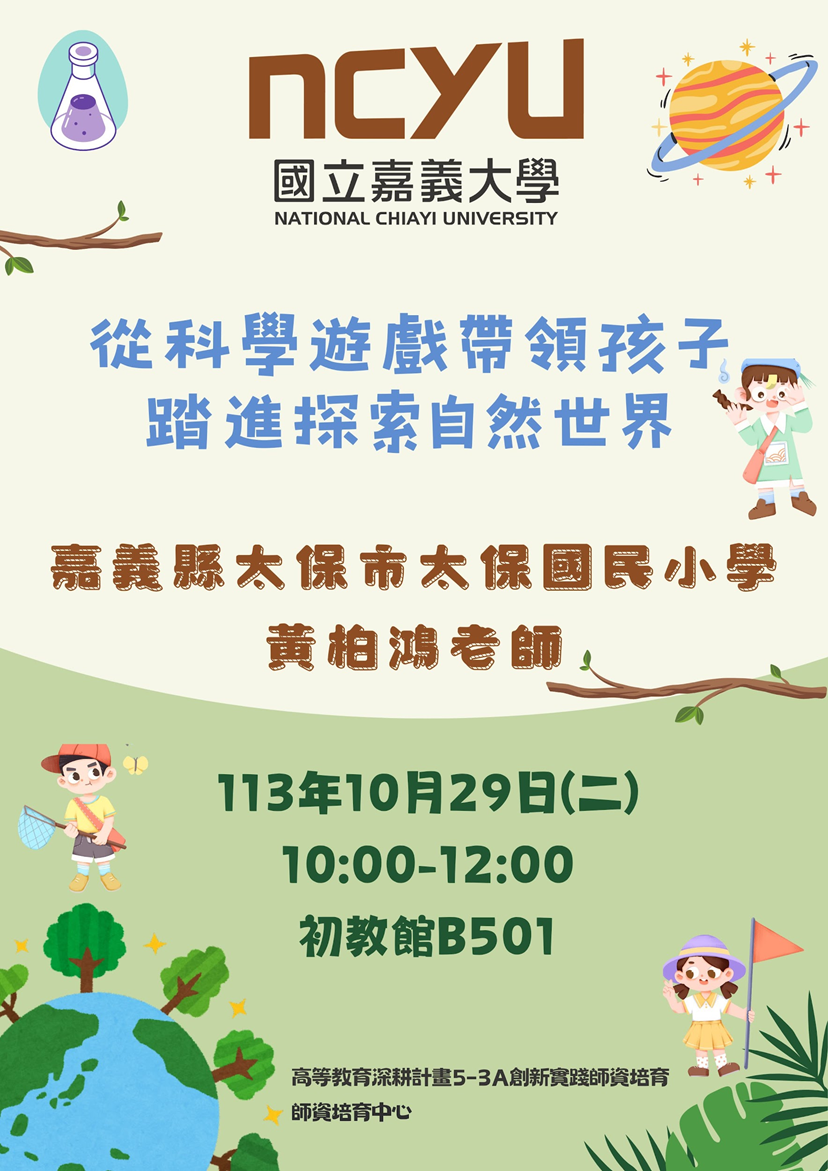活動內容 | 本次講座邀請了來自嘉義縣太保國小的黃柏鴻老師擔任講師,講座的前半部分,黃老師介紹了PBL(專題式學習),並播放了一部關於國外定期實施專題式學習的影片。此外,講師針對教師在教學現場如何實施此教學方式提出了一些建議,例如附件和書籍的選擇,以及如何創作童玩或延伸教學活動,以便更有效地融入科學概念。講師還強調了材料的選擇與處理,提到應考慮價格低廉、易於取得、效果顯著、安全且容易實作等重要因素,另外他也傳授學生判斷適當的科學遊戲有哪些特徵:遊戲應涵蓋適當的教育概念、所需材料容易取得、能引發學生好奇心、方便探討變因,且製作簡單。在說明專題式學習如何進行時,他指出可透過以下流程作爲基礎:情境呈現、器材說明、遊戲進行、結果紀錄、原理說明以及發展思考。最後,講師指出專題式學習有一些潛在風險,例如:應避免使用過於複雜、昂貴、危險或難以取得的物品;也不建議在製作過程中成人(老師)協助的比例過高;手作時間過多,導致忽略了認知、溝通討論和歸納分享的重要性;原理過於艱澀,超出學生的認知能力......,後半部分,老師準備了一些科學教材以及帶領學生實際操作與填寫學習單,讓學生在聽完講解後有實際操作的空間。 講座全程聚焦於「探究式教學」的要點和策略。講者分享了自己的經驗和資源,以及如何事先準備好所有的實驗器材,再透過簡單且非課本標準的實驗操作,突破了傳統教材的框架,使知識學習超越了課本內容,讓參與者能夠深入體驗探究和實踐的精神,最後講者還強調了師資生在自然科學教學中的挑戰,同時鼓勵他們在這個過程中,體會到孩子和老師共同成長的滿足感。 | ||||||||||||||||||||||||||||||||||||||||||||||||||||