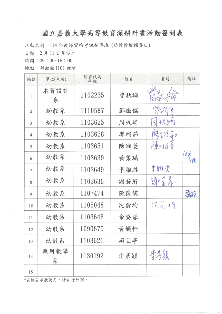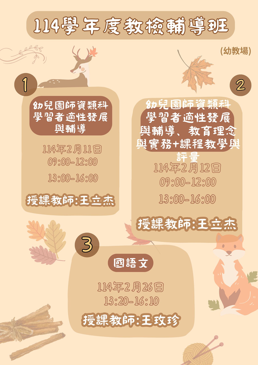 活動名稱 | 114教師資格考試輔導班(幼兒園師資類科學習者適性發展與輔導-王文杰老師) | ||||||||||