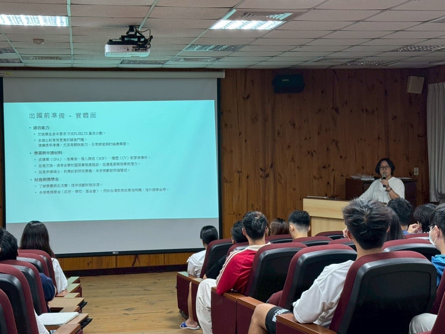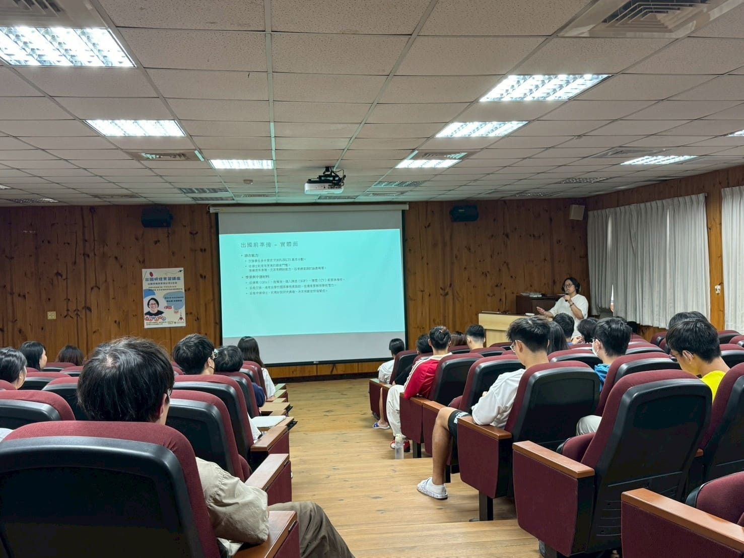 活動內容 | 本場「出國研修實習講座」於114年9月26日(星期五)下午13:20至15:10本校蘭潭校區水生生物科學系館4樓視聽教室舉行,邀請本校水生生物科學系楊松穎助理教授分享有關日本出國研修與實習前的準備。楊老師將出國前準備分為心態面、實體面、安全面三大面向,內容包含明確目標、挑戰與適應、語言能力、財務與心理準備、了解當地文化與交通等,並說明各單位與計畫提供的出國交換申請機會。除了協助同學釐清規劃出國研修的疑問,更邀請一同到琉球大學交換的鄭同學上台與學弟妹分享自身出國實習經驗。 | ||||||||||||