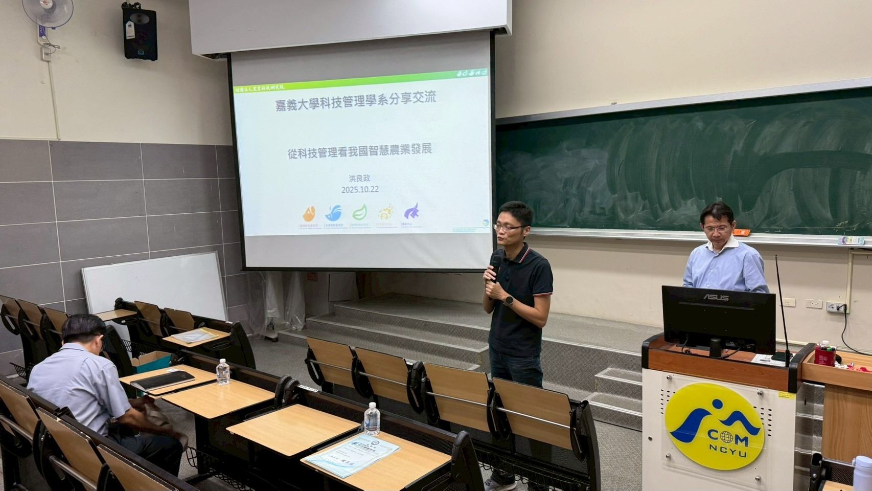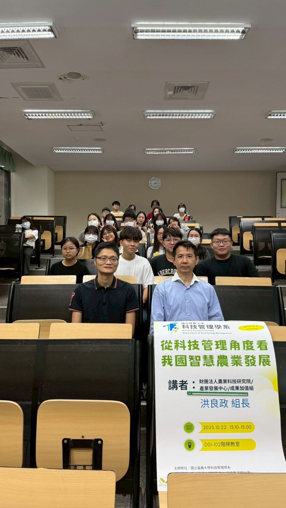 活動內容 | 這場講座主要邀請財團法人農業科技研究院產業發展中心副主任洪良政博士,以「從 科技管理看我國智慧農業發展」為題進行分享。內容著重從科技管理與產業分析的 角度探討智慧農業的現況與未來發展方向,說明如何結合人工智慧、物聯網、大數據 等新興科技應用於農業生產與經營管理。講者介紹農業科技研究院在推動智慧農業、 技術商品化及國際化行銷的具體作法,並透過 PEST 與 SWOT 分析解析產業外部環 境與政策推動工具,同時比較日本、美國與歐盟的智慧農業案例,說明台灣在新農業 政策與數位轉型中的優勢與挑戰。講座最後以「永續、韌性、智慧、安心」為核心理 念,強調農業創新、數位化與低碳永續並重的重要性,讓學生能從科技管理觀點理解 農業產業化與智慧化的趨勢,拓展對農業科技應用與產業永續的整體認識。 | ||||