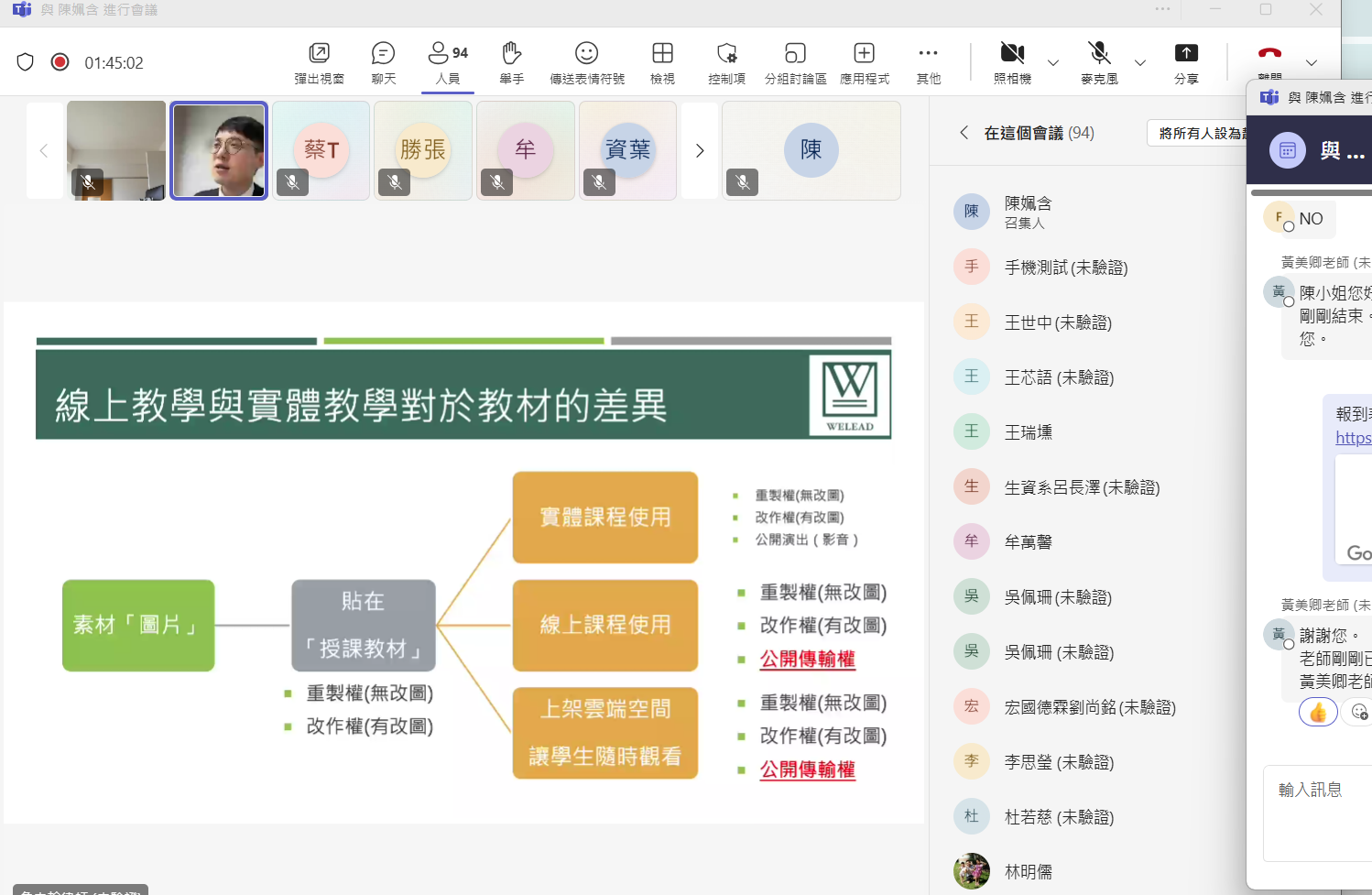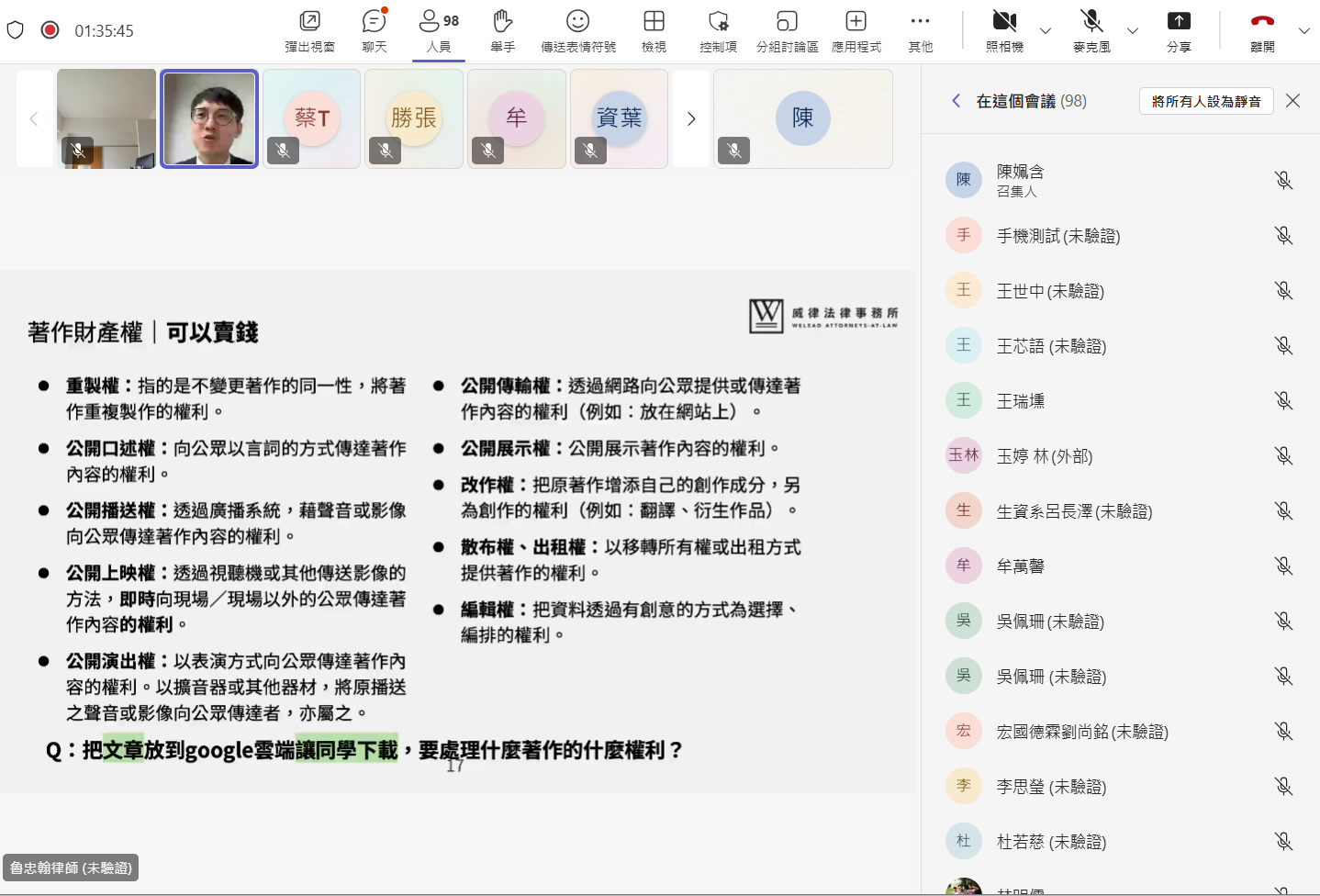活動內容 | 邀請威律法律事務所魯忠翰律師辦理線上講座。講解教師於線上教學及數位教材製作過程中可能涉及的著作權議題,說明教材引用、影像與音樂使用、公開播送及合理使用等相關法規與實務案例,協助教師提升著作權意識,避免侵權風險。 | ||||||||||||