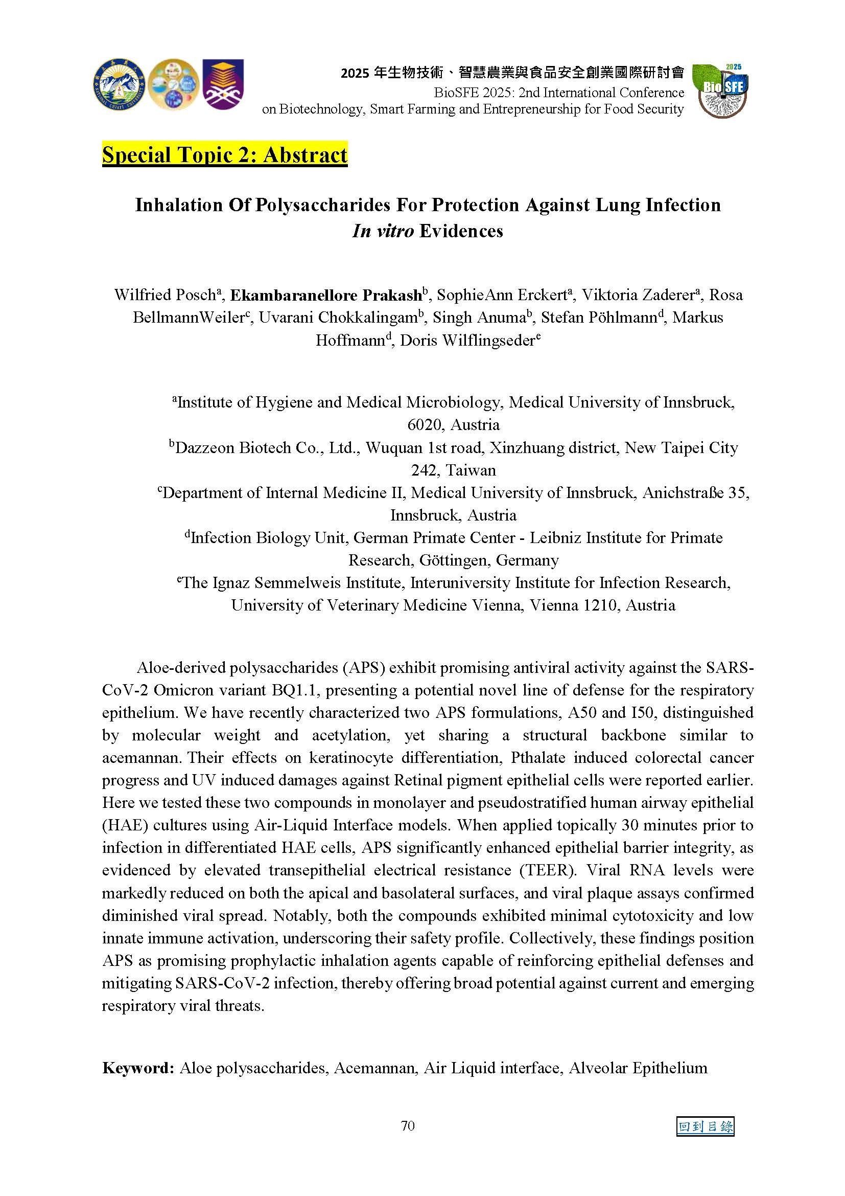 執行成果 | 本次講座共計327人參與。 透過本次講座,參與者對多醣類作為呼吸道防護策略之潛在應用有了更深入的理解。講師以體外實驗研究為基礎,說明蘆薈來源多醣(APS)在增強呼吸道上皮屏障功能與抑制病毒感染上的作用機制,使與會者對非傳統抗病毒策略在呼吸道防護中的角色有更全面的認識。 此外,參與者對研究中運用氣液界面(Air–Liquid Interface)人類呼吸道上皮細胞模型進行評估的實驗設計留下深刻印象。相關結果顯示,APS 可有效提升上皮屏障完整性、降低病毒 RNA 表現量,並抑制病毒擴散,同時展現低細胞毒性與低度免疫活化反應,讓與會者進一步理解其作為預防性吸入劑之安全性與可行性。