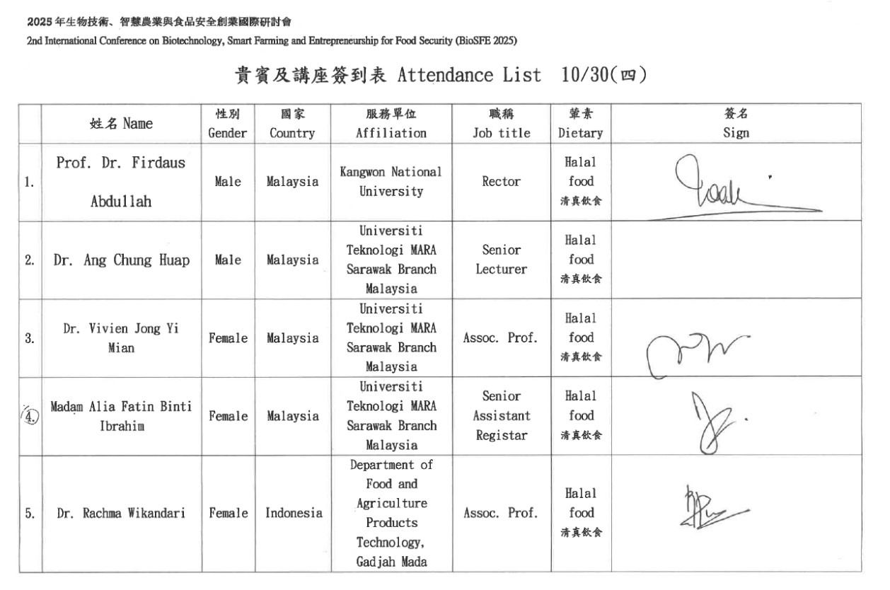 活動內容 | 隨著全球人口持續成長,提高糧食生產者的生產力和質量,同時確保糧食安全,並透過農業實現永續收入,變得越來越緊迫。因此,馬來西亞瑪拉工藝大學砂拉越分校(Universiti Teknologi MARA Sarawak Branch;UiTM)在砂拉越農業現代化及區域發展部及臺灣國立中正大學協辦下,於2023年9月25~27日,舉辦3天的國際研討會。 本校為積極推動新南向政策,強化東南亞國家的學術交流與合作,特別安排生命科學院5系所和農學院2系所,與台灣生物科技暨健康產業協會和UiTM,主辦第2屆BioSFE 2025。在這正值全球農業處於深刻變革的關鍵時刻,除氣候變遷、自然資源枯竭、人口成長外,甚至受全球政治、經濟與安全局勢影響,使需求更加急迫。除延續研討會對生物技術、智慧農業與創業與商業模式議題之探討,更致力於促進臺灣與馬來西亞,再延伸至新加坡、泰國、印尼、斯里蘭卡與印度的產學交流,藉由強化國際夥伴關係,進而推動這些國家的農業轉型與互惠發展。 本研討會共規劃3場主題演講(Keynote)、8場邀請演講(Invited Lecture)與2場產業論壇(6位講員),合計17位講員。外籍講員包括馬來西亞4位(1位線上),以及新加坡、泰國、印尼、斯里蘭卡與印度各1位,合計9位。 此份『國際大師講座』申請為第3場主題演講,講員為預計在開幕式與本校林翰謙校長和陳瑞祥副校長進行MoA簽署的UiTM砂拉越分校校長Prof. Dr. Firdaus Abdullah。講座將聚焦智慧農業供應鏈的創新物流與永續經濟影響。他將探討如何透過數位科技與綠色投資,提升農業效率並促進區域經濟發展。演講亦強調國際合作在推動農業轉型中的關鍵角色,特別是臺灣與東南亞國家的產學連結。整體內容緊扣SDGs,尤其是糧食安全、經濟成長與氣候行動。 | ||||||||||||