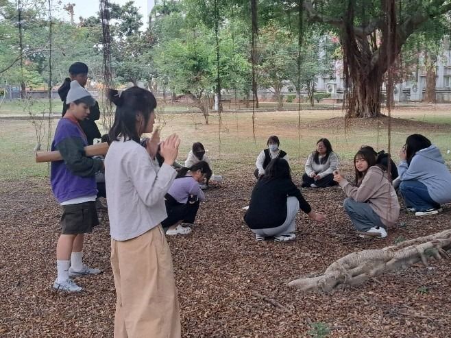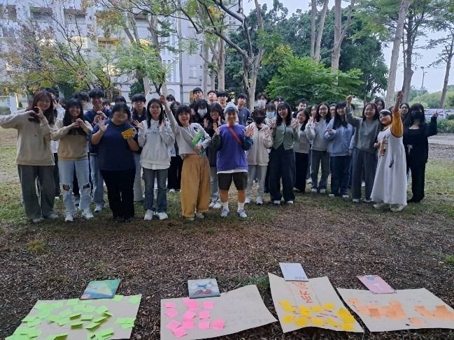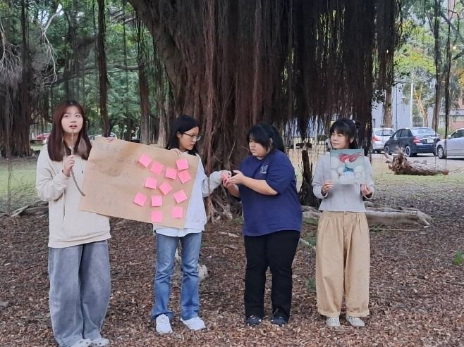 當天天氣其實陰陰的,不過並未下雨,於是,講者將全班重新分成四組,帶到教室外的大榕樹下。每組分到一本繪本,分別有《櫻桃樹》、《小老鼠的夢想》、《跟著風兒一起飛吧》、《一個關於兔子的夢》。他們發給每組一大張海報紙和一疊便條紙,請同學當作設計「教案」展開討論: 01這本繪本想談的「夢想」是什麼? 02如果要設計活動,你會怎麼帶? 一開始大家有點拘謹,但約莫五分鐘後,陸續有人開始說故事、丟想法,小組討論逐漸熱絡起來。榕樹下的每段討論聲、每個專注眼神以及每張笑容,都是很美的學習畫面。恩典跟我說,把大家帶到戶外,是為了讓學生與「土地」跟「人」重新連結。雖然一開始也擔心陌生的小組會不會冷場,但他們選擇相信大家,相信在一陣摸索後,會找到方法,並在團體中發揮各自的特質。 二十分鐘後,講者請各組在榕樹下分享成果,儘管已經快下課,昏黃色的路燈亮起,大家仍很安靜地聽著樹下的同學各抒己見。沫溧一直跟我說同學們好優秀,她很感動。這場演講不僅展示了繪本作為情感教育媒介的可能,也讓人感受到:故事能療癒、能陪伴,也能給人前進的勇氣。
