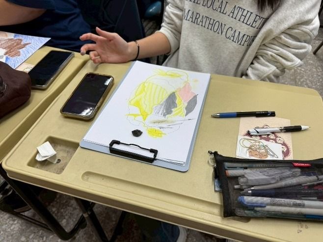 接下來,他們借助繪本《坐在世界的一角》設計繪圖活動。此書描述一塊看似平凡、卻屹立不搖的石頭,如何成為孩子眼中的萬種可能。活動中,講者請同學們拿起一顆小石頭,將筆尖抵在石頭上,讓石頭「推著」筆在紙上前進。軌跡歪斜也好、突然中斷也沒關係。沫溧說:「隨心所欲,不必拘泥成敗,因為石頭永遠都在。」我覺得這話很溫柔,卻充滿力量和生命的通透。大家一邊投入作畫、一邊沉浸在「學習」裡,配著悠悠的樂聲,整個教室被靜謐的午後時光包覆著。
