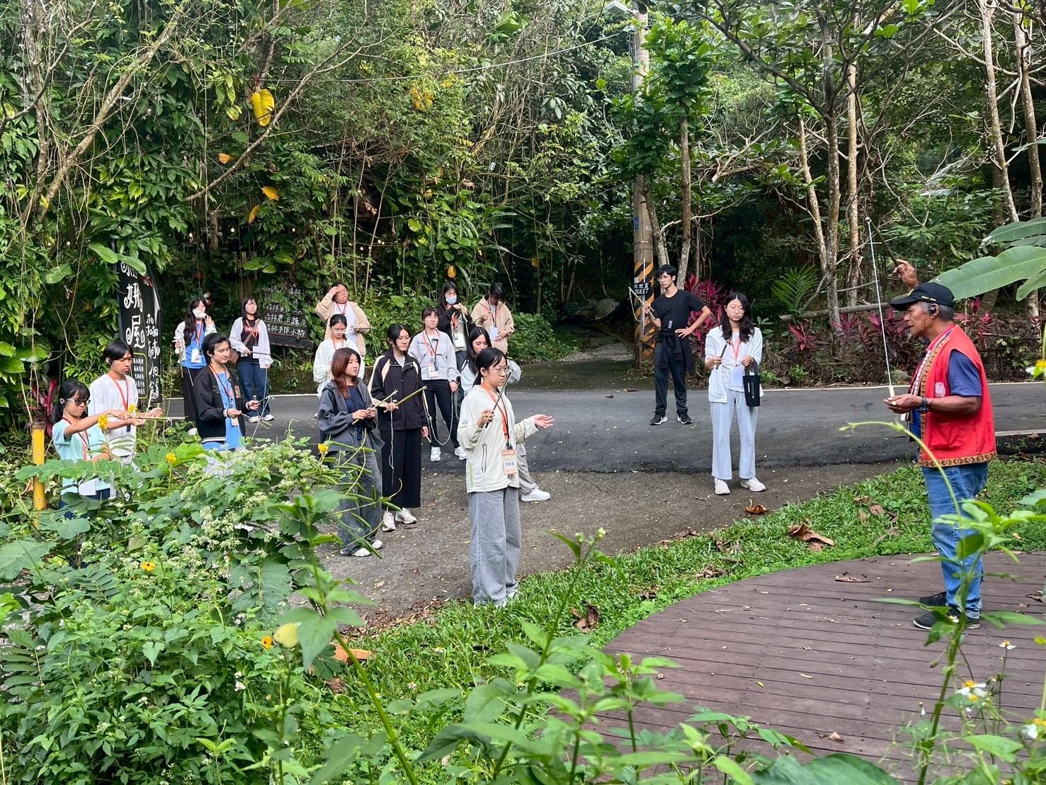 檢討與建議 | 1. 執行上的問題或困難處: (1)步道的不確定性:當天前往步道時才發現入口被拉起危險封條,致電林務局後才得知步道內有虎頭蜂的活動範圍。為了確保學生安全,只能臨時將原訂下午的課程調整到上午進行,並將下午改為鄒族捕魚文化的相關內容。後續也了解到,秋季正是採集虎頭蜂蜂蛹的最佳時期,因為這段期間蜂群數量達到高峰、活動也最為頻繁。因此,這門課程會受到季節影響相當大,進而增加實作活動的不可預測性。 (2)上課現場的昆蟲干擾:在進行童玩製作與下午的鄒族捕魚文化課程時,現場偶爾會出現體型較大的無害昆蟲飛近學生身邊。雖然不具危險性,但仍對部分學生的情緒及專注力造成影響,尤其是對昆蟲較為敏感或畏懼的同學。因此,未來在選擇戶外授課地點時,需更加留意環境特性,包括昆蟲活動頻率與周遭植被狀況,以減少干擾並確保教學品質。 2. 教師或學生的變化:大多的學生都是第一次接觸鄒族文化、做童玩,對他們是很新鮮的。學生都很努力的記下植物的特徵、作用及完成童玩和作業要求。作為教師的我,看到各科系的學生都能從這活動找到連結點,不僅覺得他們的連結很有創意也深感與有榮焉。 | ||||||||