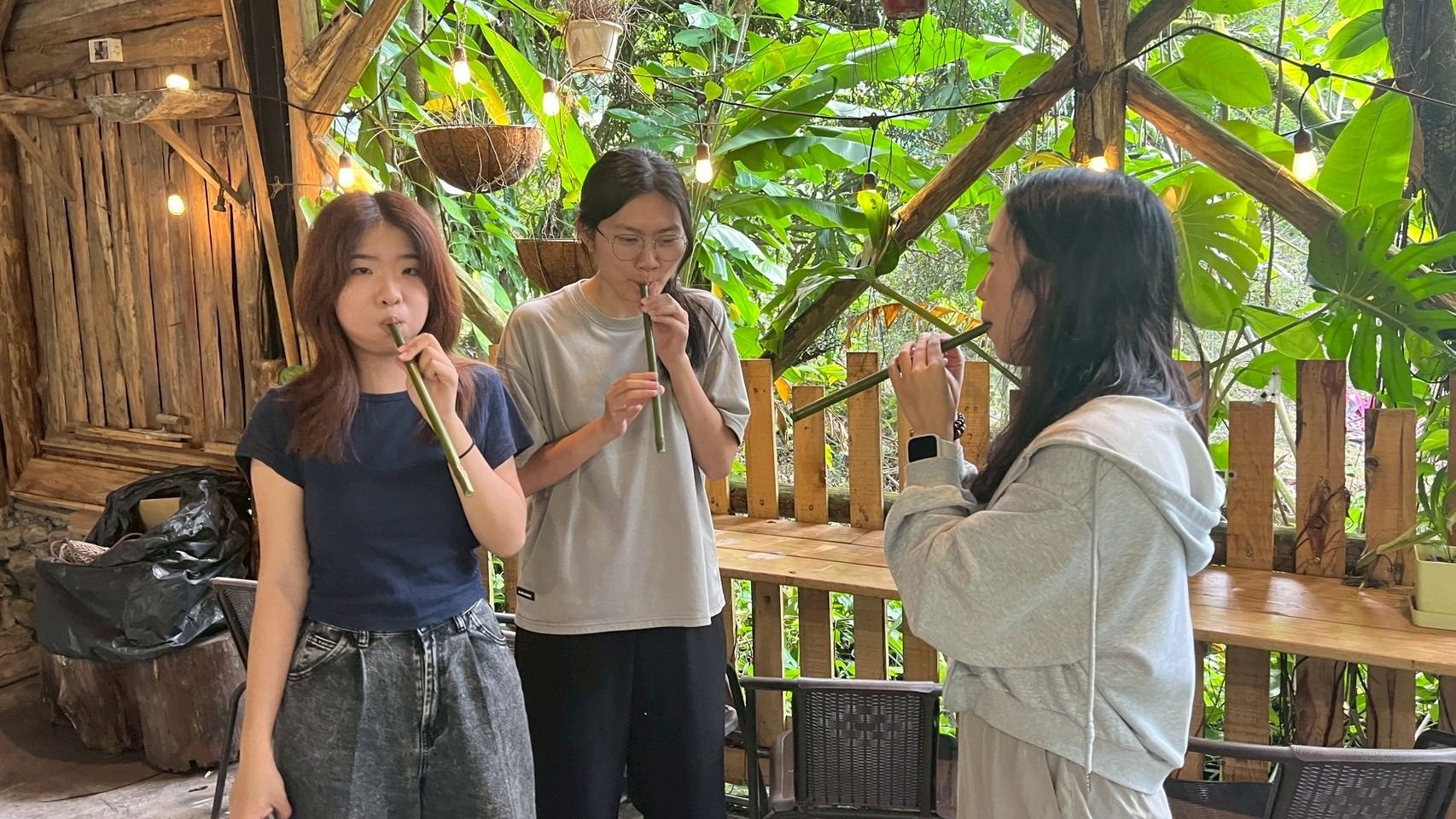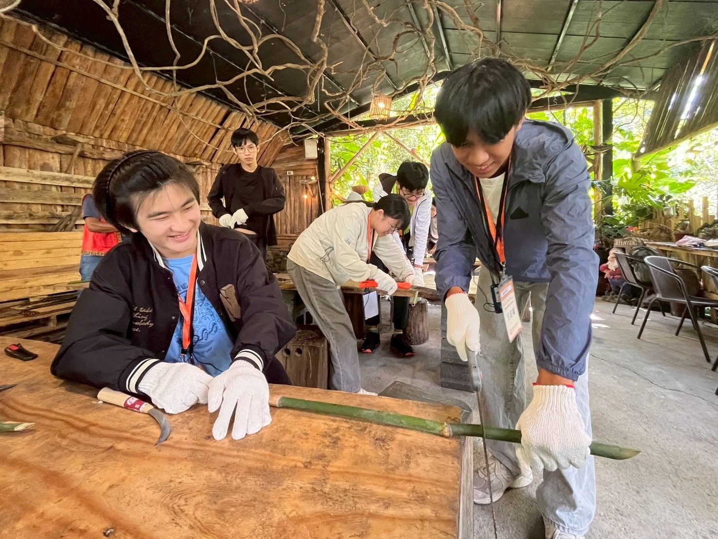 利用大刀將竹子剖面再各分四分竹條,再把竹條鋸到約12 公分的長度。拿出小刀把子竹塊削成竹片,竹片厚度不可一致需由厚到薄,厚度落在0.3-0.1公分。竹片削好後戳洞,用繩子將竹片綁在細竹條上,即可完成。 B. 單音竹笛: 準備一段無節的竹子,先在一端的竹口進行四十五度斜切。在斜切面的短邊邊緣,用小刀往內割出一條細縫,將五節芒的葉子卡入細縫中。把葉子凸出的部分削平,再將五節芒修剪到與斜切面的長邊同長。吹奏時嘴巴含住斜切面,口腔內部不碰觸到葉片,即可發出聲音。 C. 竹炮: 首先,選擇一根較粗的竹子與一根較細的竹子,細竹需能夠剛好塞入粗竹的內部。粗竹必須保留一端的竹節,並將細竹鋸成比粗竹短約一公分的長度。接著,將粗竹的竹節鋸下,並固定在細竹的一端,作為推動時的握把。製作完成後,取濕紙巾或濕衛生紙塞入粗竹內部,用細竹推到底部,讓紙團緊貼竹節處。再放入另一個濕紙團,推至約粗竹中段的位置。最後,快速將細竹推到底部,因壓力瞬間產生,會將前端的濕紙團**「砰!」地一聲從竹炮中發射出去,產生聲響與驚喜效果**,是一種傳統有趣的童玩。 D. 山羌笛: 竹子留一段「節」的位置做為鋸子的切割點,並切割特定長度後建議十五至二十公分,切割為一段閉管,另一段為開管的竹子。將竹子開管部分為起點,用鐮刀切割剖半竹子一半,下方竹子仍連著不切開。分把竹身分為五等份,前五分之一保留不削,後五分之四要削薄竹片兩邊。邊削邊吹直至發出聲音,即完成山羌笛。 四、tohi'u 草束撈魚蝦 依照河川地形與生物習性,運用極簡、卻非常有效的方式進行捕魚蝦。 製作過程: 1. 採集野草,把它們綁成一大束。 2. 直接放進比較平靜、沒那麼湍急的河潭裡。 3. 草束本身就像天然的躲藏處,溪裡的魚跟溪蝦會自己鑽進去躲著。 4. 放上幾天之後,再把草束整束拖到河邊,就可以輕鬆把躲在裡面的魚蝦撿起來。 五、作業內容布達、意見回饋填答、心得分享 | ||||||||