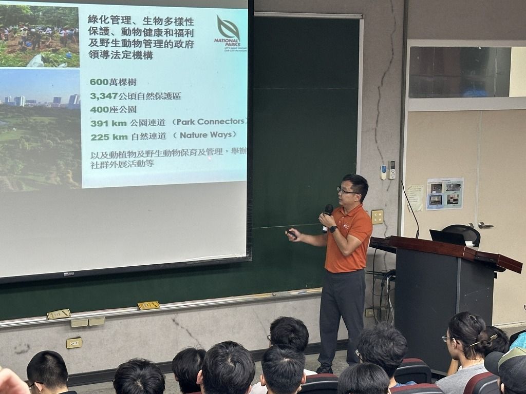 活動內容及執行成果 | 活動內容 本次全校公開實體演講邀請具有新加坡國家公園局16年專業經驗的Dr. Wilson蒞校分享,主題為Singapore’s Greening Journey: From Garden City to City in Nature(新加坡城市綠化的演進:從花園城市到大自然中的城市)。Dr. Wilson在新加坡國家公園局中曾在多個部門擔任要職,專業領域涵蓋城市園藝、公園景觀規劃、園藝技術發展、植物管理及食農教育推廣等。演講中,Dr. Wilson先回顧新加坡自1960年代以來提出「花園城市」願景的重要里程碑,並說明新加坡是如何逐步推動至現在「大自然中的城市」的發展策略。接著,他透過實際案例介紹新加坡在都市綠化規劃、植栽管理及生態永續方面的具體作法,以及在政策制定與社會推廣上的挑戰與成果。Dr. Wilson也分享自身參與國家綠色空間規劃的經驗,並提出新加坡如何在高密度都市環境下,平衡生態保護與市民生活品質的觀察與省思。 執行成果 本場演講共有7位教職員與104位學生參與,教室座無虛席。Dr. Wilson以豐富的實務經驗分享新加坡從「花園城市」邁向「大自然中的城市」的發展歷程,讓與會師生更深入理解新加坡都市綠化策略、公共空間設計及綠色基盤推動的關鍵原則;演講內容更提及跨部門合作、社區參與及公民綠化行動,促使大家思考台灣與新加坡在都市綠化推動上的異同與可借鏡之處。在互動環節中,江彥政老師鼓勵同學踴躍參與討論並用英文提問,讓學生能直接與講者交流,像是有同學把握機會詢問新加坡在景觀規劃與植物管理上的具體作法,從中學習到如何將國際經驗應用於本地環境。 整體來說,現場交流熱烈、氣氛融洽。經由這次演講,不僅拓展學生的國際視野,也加深大家對不同文化背景與專業技術的理解,對未來課程學習與研究具有很高的參考價值;而演講內容亦可作為系上老師課程案例的補充,幫助學生將理論應用在實務上,更清楚理解景觀設計如何與都市永續結合。 | |||||||||