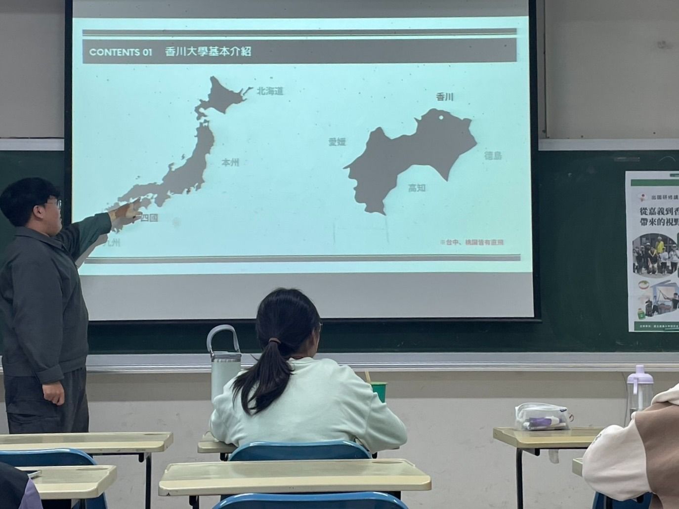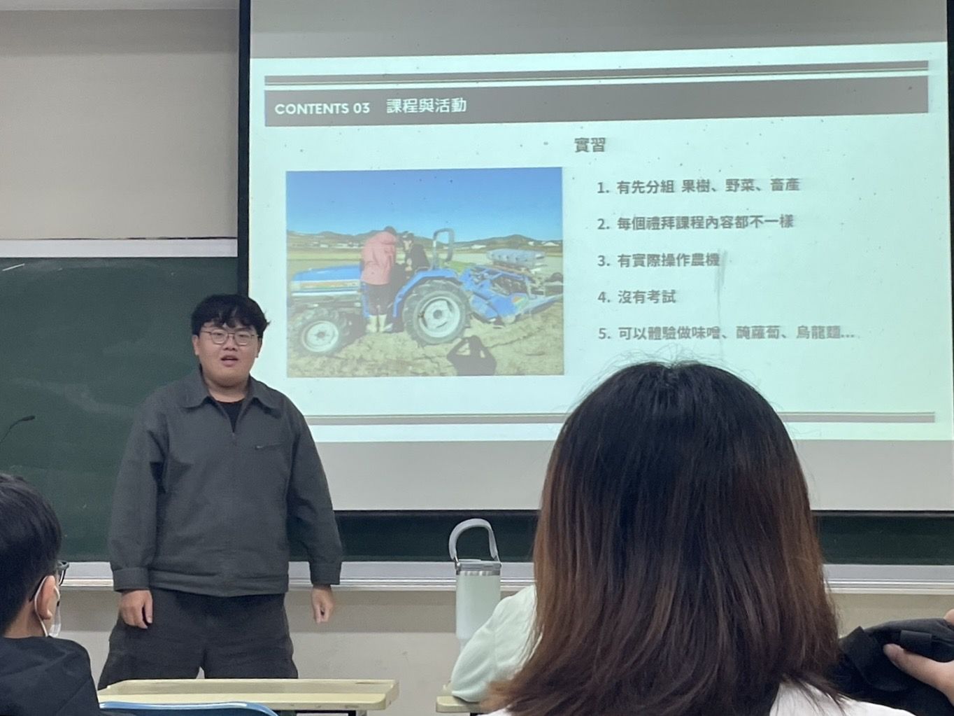 活動內容 | 本次講座由農藝學系大四學生羅子祐擔任講者,在嘉大新民校區舉辦。活動內容圍繞著講者前往日本香川大學進行為期一年交換研修的寶貴經驗。羅同學透過 Google Earth 的實境圖與地理位置圖,引導聽眾認識位於四國的香川縣及校區分布,也詳盡地分享了學術與實作並重的留學生活,特別是「應用生物科學領域倫理」課程,介紹了每週由不同老師授課、強調小組討論以及期末撰寫小論文的扎實訓練。羅同學針對農藝系學生的專業背景,深入展示了在香川大學的「實習」環節,這部分包含果樹、蔬菜、畜產的分組實作,以及親自操作大型農機的難得體驗,除了學術專業,更有豐富的文化沉浸活動,如體驗味噌、碗豆苗製作,甚至是道地的烏龍麵手作課程。整場講座不僅僅是資訊的傳遞,更透過豐富的影像紀錄,展現了從農田勞作到國際交流的多樣化生活面向,讓在場同學對海外交換有了具體且充滿活力的想像。