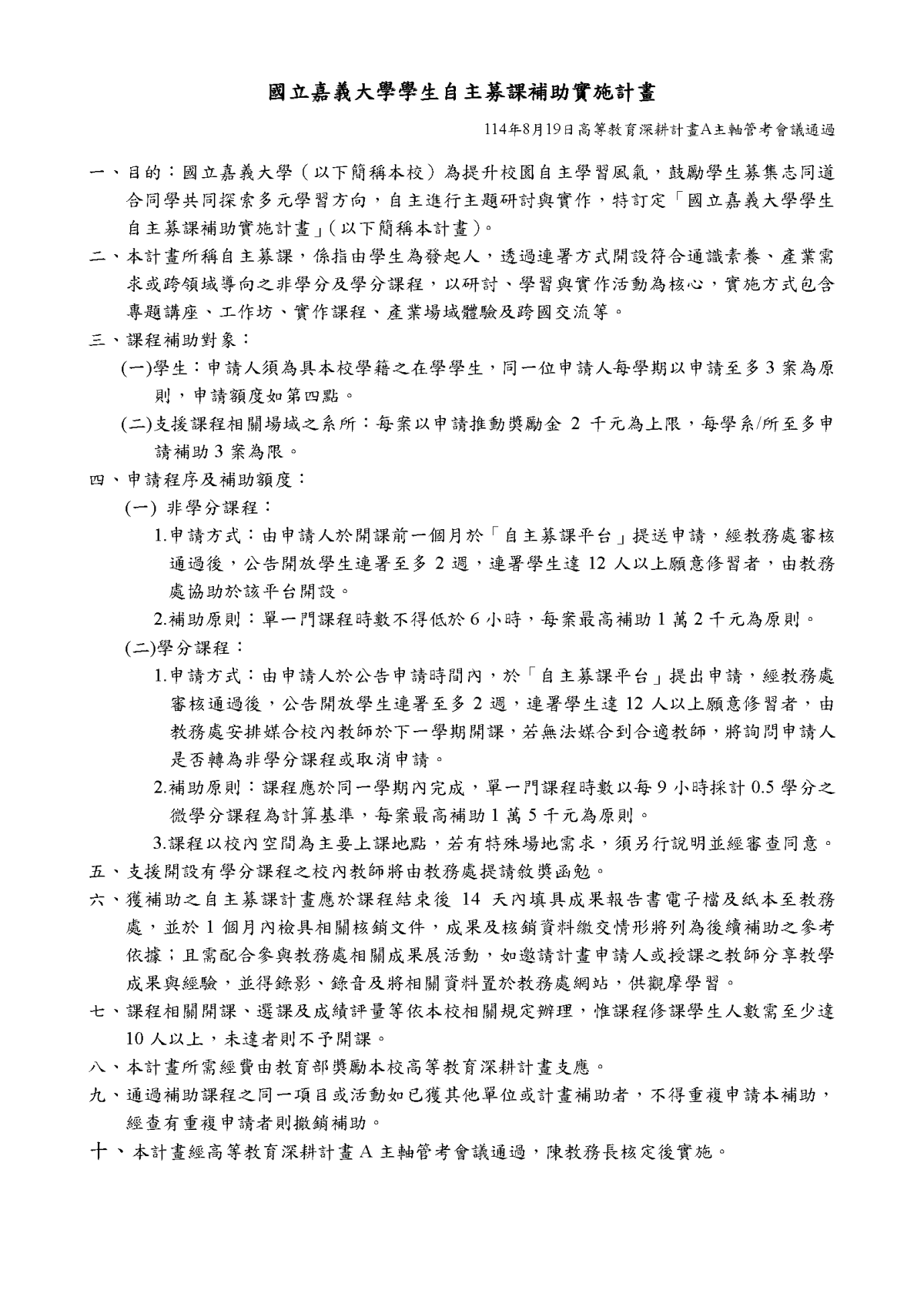 國立嘉義大學學生自主募課補助實施計畫