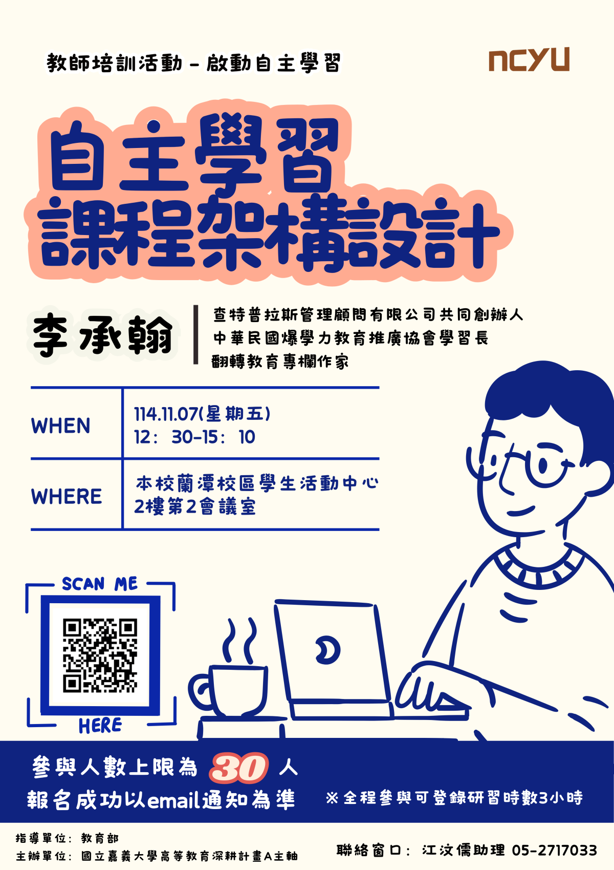 本場次參與人數上限30人,報名完成後將透過email通知是否報名成功,請參加教師留意信件,如活動前2天仍未收到任何信件,請與深耕計畫A主軸辦公室江汶儒助理聯繫(電話:05-2717033),謝謝。