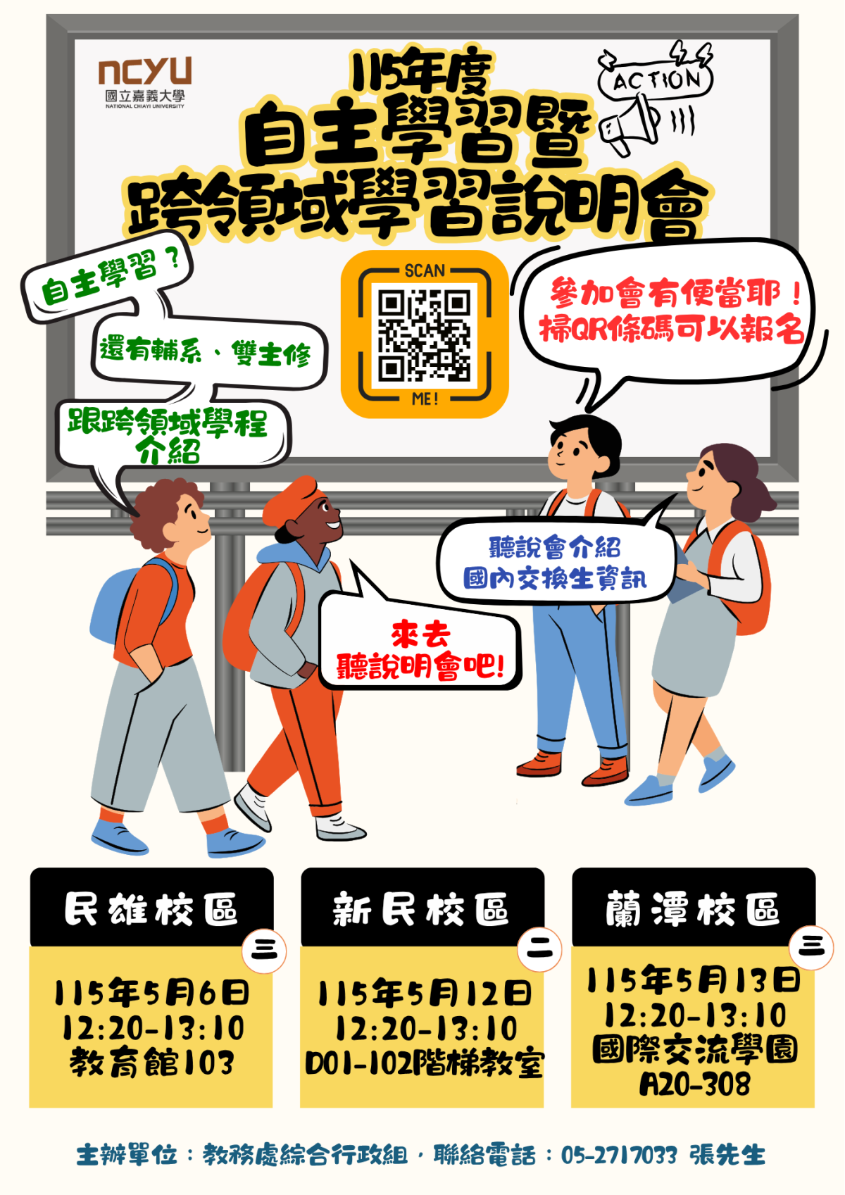 115年度自主學習曁跨領域學習說明會,除了針對課程類的「微學分課程、EMI課程、跨領域學程、輔系及雙主修」、還有非課程類的「自主學習成果展現週」、「通識教育/創業或就業講座」等進行簡單介紹的外,更會邀請修讀輔系、雙主修的學生分享修習前中後的心路歷程及經驗。同時也會介紹申請「國內交換生」的眉眉角角,提供想出國留學又有諸多考量無法出國的學生另一種選擇。