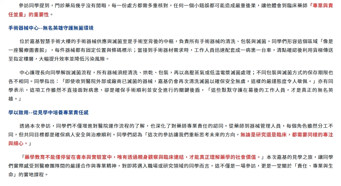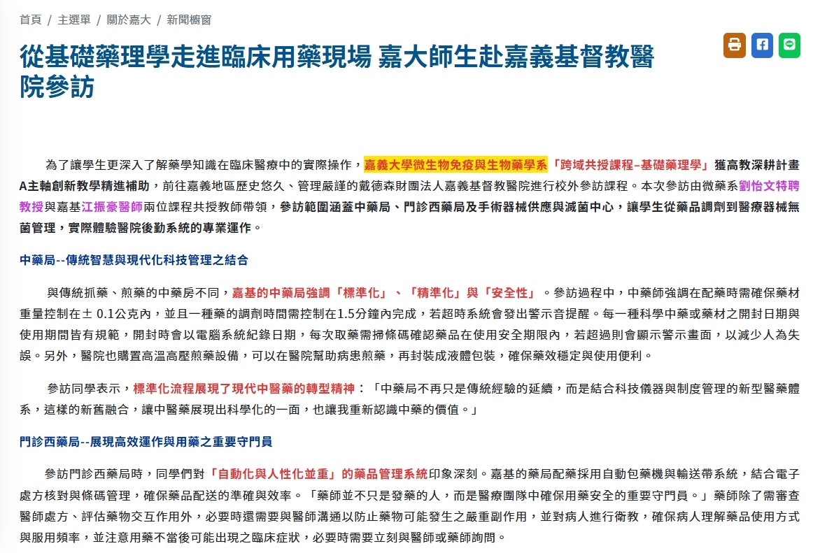 從基礎藥理學走進臨床用藥現場,嘉大師生赴嘉大基督教醫院參訪