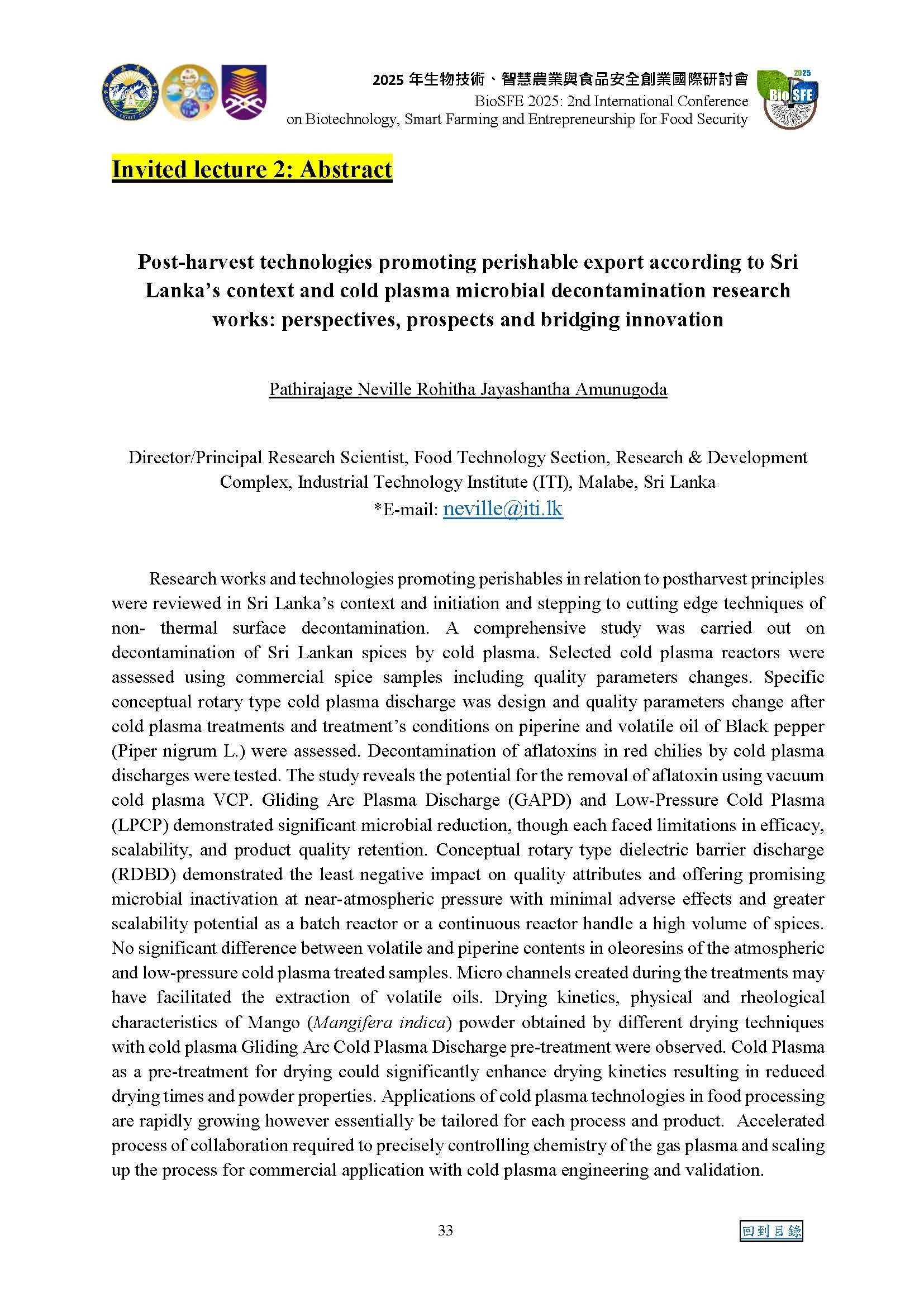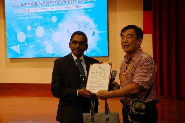 活動內容 | 隨著全球人口持續成長,提高糧食生產者的生產力和質量,同時確保糧食安全,並透過農業實現永續收入,變得越來越緊迫。因此,馬來西亞瑪拉工藝大學砂拉越分校(Universiti Teknologi MARA Sarawak Branch;UiTM)在砂拉越農業現代化及區域發展部及臺灣國立中正大學協辦下,於2023年9月25~27日,舉辦3天的國際研討會。 本校為積極推動新南向政策,強化東南亞國家的學術交流與合作,特別安排生命科學院5系所和農學院2系所,與台灣生物科技暨健康產業協會和UiTM,主辦第2屆BioSFE 2025。在這正值全球農業處於深刻變革的關鍵時刻,除氣候變遷、自然資源枯竭、人口成長外,甚至受全球政治、經濟與安全局勢影響,使需求更加急迫。除延續研討會對生物技術、智慧農業與創業與商業模式議題之探討,更致力於促進臺灣與馬來西亞,再延伸至新加坡、泰國、印尼、斯里蘭卡與印度的產學交流,藉由強化國際夥伴關係,進而推動這些國家的農業轉型與互惠發展。 本研討會共規劃3場主題演講(Keynote)、8場邀請演講(Invited Lecture)與2場產業論壇(6位講員),合計17位講員。外籍講員包括馬來西亞4位(1位線上),以及新加坡、泰國、印尼、斯里蘭卡與印度各1位,合計9位。 此份『國際大師講座』申請為第2場邀請演講,由斯里蘭卡工業技術研究院(ITI)食品科技部門的資深研究科學家Dr. Neville Rohitha Jayashantha Amunugoda主講,聚焦於提升易腐農產品出口的技術創新。特別強調採收前與採收後的安全處理流程,包括品質控管、包裝技術與冷鏈管理,以確保產品在出口過程中保持新鮮與安全。內容結合食品科技、農業工程與國際貿易,展現永續農業與全球供應鏈的實務連結。 | ||||||||||||