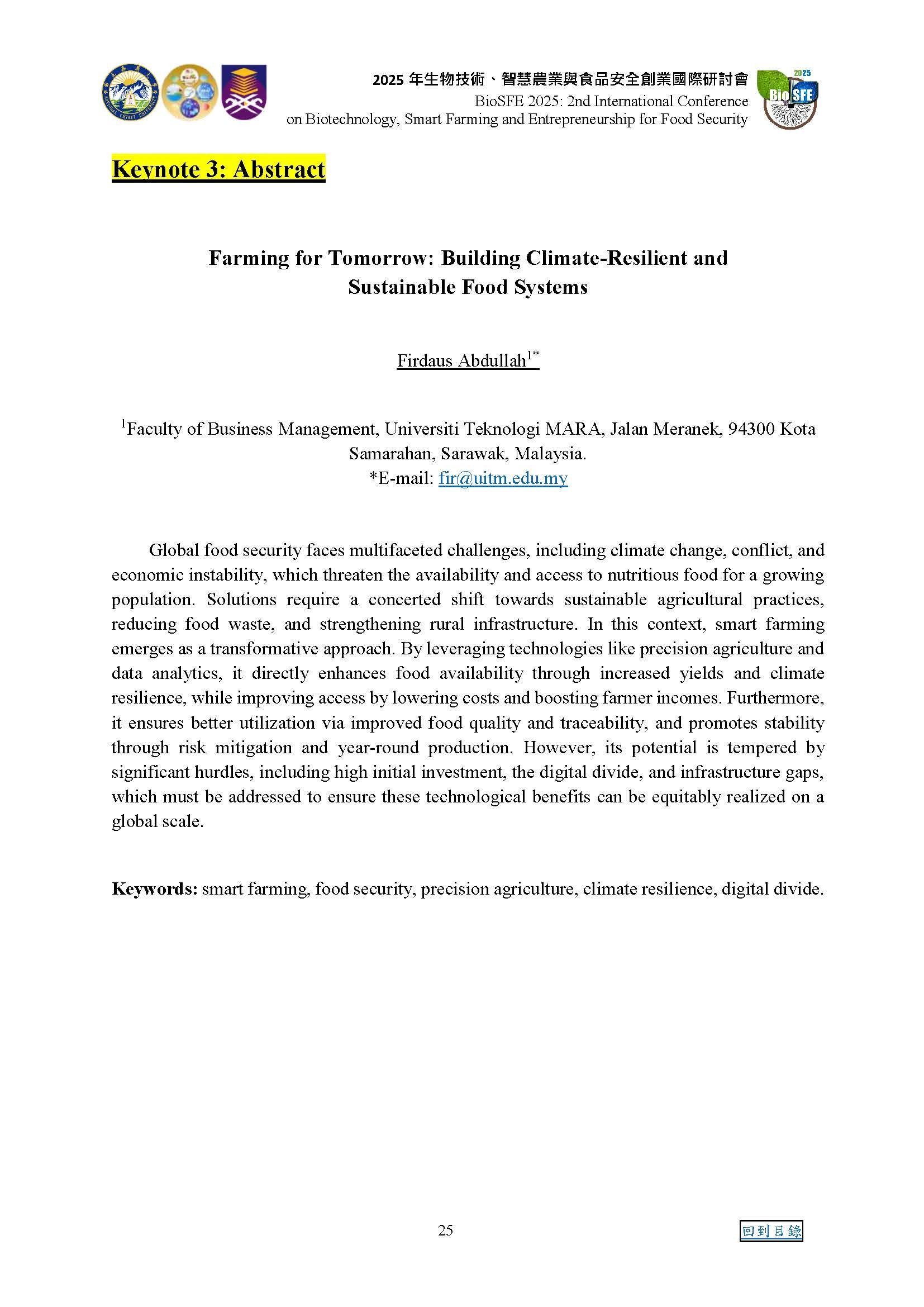 活動內容 | 隨著全球人口持續成長,提高糧食生產者的生產力和質量,同時確保糧食安全,並透過農業實現永續收入,變得越來越緊迫。因此,馬來西亞瑪拉工藝大學砂拉越分校(Universiti Teknologi MARA Sarawak Branch;UiTM)在砂拉越農業現代化及區域發展部及臺灣國立中正大學協辦下,於2023年9月25~27日,舉辦3天的國際研討會。 本校為積極推動新南向政策,強化東南亞國家的學術交流與合作,特別安排生命科學院5系所和農學院2系所,與台灣生物科技暨健康產業協會和UiTM,主辦第2屆BioSFE 2025。在這正值全球農業處於深刻變革的關鍵時刻,除氣候變遷、自然資源枯竭、人口成長外,甚至受全球政治、經濟與安全局勢影響,使需求更加急迫。除延續研討會對生物技術、智慧農業與創業與商業模式議題之探討,更致力於促進臺灣與馬來西亞,再延伸至新加坡、泰國、印尼、斯里蘭卡與印度的產學交流,藉由強化國際夥伴關係,進而推動這些國家的農業轉型與互惠發展。 本研討會共規劃3場主題演講(Keynote)、8場邀請演講(Invited Lecture)與2場產業論壇(6位講員),合計17位講員。外籍講員包括馬來西亞4位(1位線上),以及新加坡、泰國、印尼、斯里蘭卡與印度各1位,合計9位。 此份『國際大師講座』申請為第3場主題演講,講員為預計在開幕式與本校林翰謙校長和陳瑞祥副校長進行MoA簽署的UiTM砂拉越分校校長Prof. Dr. Firdaus Abdullah。講座將聚焦智慧農業供應鏈的創新物流與永續經濟影響。他將探討如何透過數位科技與綠色投資,提升農業效率並促進區域經濟發展。演講亦強調國際合作在推動農業轉型中的關鍵角色,特別是臺灣與東南亞國家的產學連結。整體內容緊扣SDGs,尤其是糧食安全、經濟成長與氣候行動。 | ||||||||||||