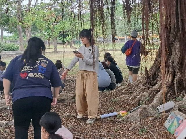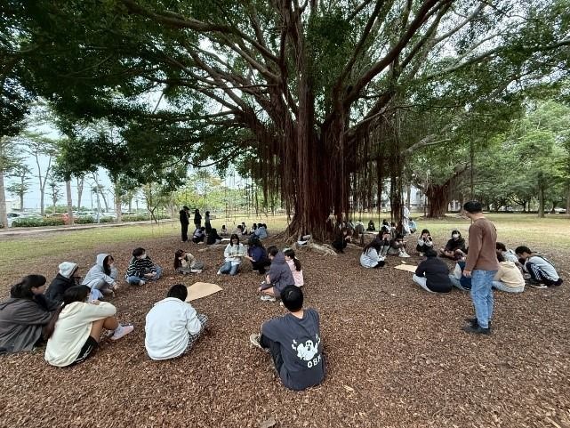 當天天氣其實陰陰的,不過並未下雨,於是,講者將全班重新分成四組,帶到教室外的大榕樹下。每組分到一本繪本,分別有《櫻桃樹》、《小老鼠的夢想》、《跟著風兒一起飛吧》、《一個關於兔子的夢》。他們發給每組一大張海報紙和一疊便條紙,請同學當作設計「教案」展開討論: 01這本繪本想談的「夢想」是什麼? 02如果要設計活動,你會怎麼帶? 一開始大家有點拘謹,但約莫五分鐘後,陸續有人開始說故事、丟想法,小組討論逐漸熱絡起來。榕樹下的每段討論聲、每個專注眼神以及每張笑容,都是很美的學習畫面。恩典跟我說,把大家帶到戶外,是為了讓學生與「土地」跟「人」重新連結。雖然一開始也擔心陌生的小組會不會冷場,但他們選擇相信大家,相信在一陣摸索後,會找到方法,並在團體中發揮各自的特質。 二十分鐘後,講者請各組在榕樹下分享成果,儘管已經快下課,昏黃色的路燈亮起,大家仍很安靜地聽著樹下的同學各抒己見。沫溧一直跟我說同學們好優秀,她很感動。這場演講不僅展示了繪本作為情感教育媒介的可能,也讓人感受到:故事能療癒、能陪伴,也能給人前進的勇氣。