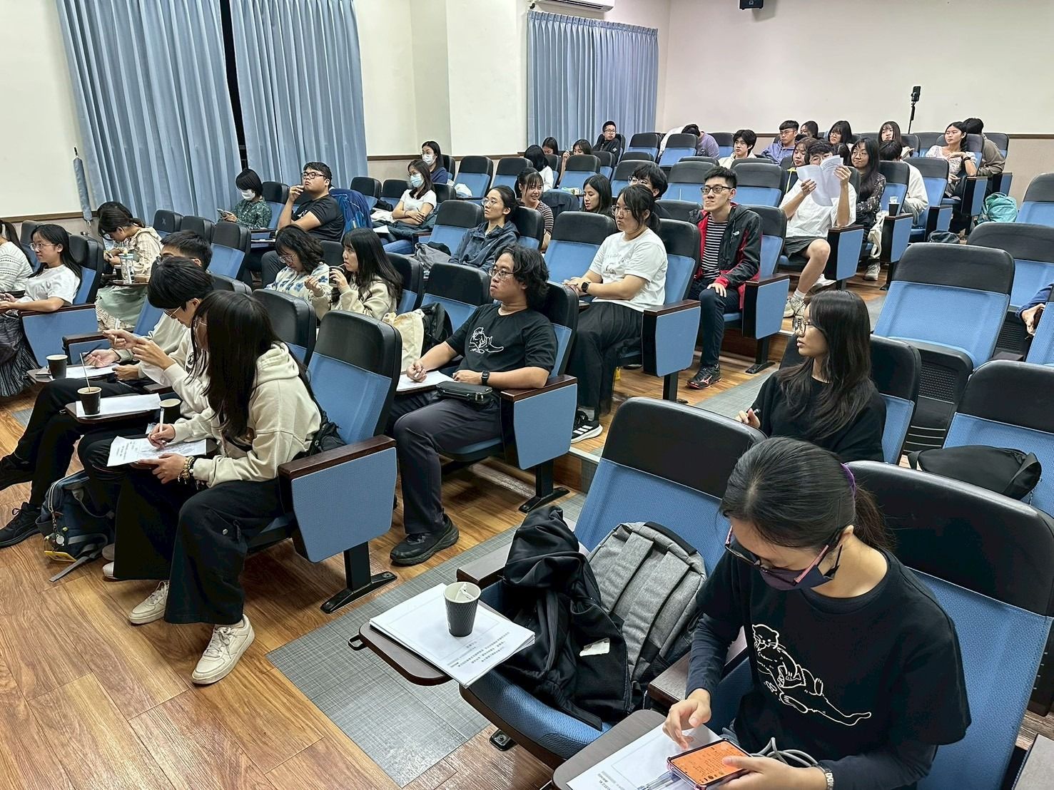 檢討與建議 | 1. 活動時間掌握度,因本活動為系列講座的第二場,且前一講座進行互動體驗的時長較長導致活動較晚開始。之後建議可增加兩場講座間的休息緩衝時間以免耽誤講師開始時間。 2. 因講師發放的講義需要自己動筆畫蟬繞畫、自由書寫等,而部分同學未攜帶原子筆,建議未來於活動行前通知請同學帶筆及器材準備時需購買一盒原子筆。 3. 因103教室為視聽教室且無長桌,建議未來需額外借用長桌作為簽到台及發放講義的地方。 | ||||||||||||