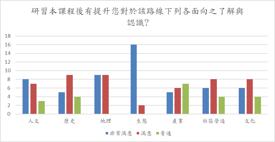 詢問修課生研習本課程後是否有提昇對於該路線各面向之了解與認識,說明了課程內容符合生態及地理面向,較無關聯的面向為產業。