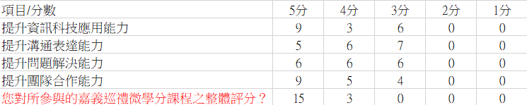 詢問修課生研習本課程後是否有提升相關能力,在資訊科技應用能力及團隊合作能力上有顯著提升;且全數修課生皆對於本課程評價高分。