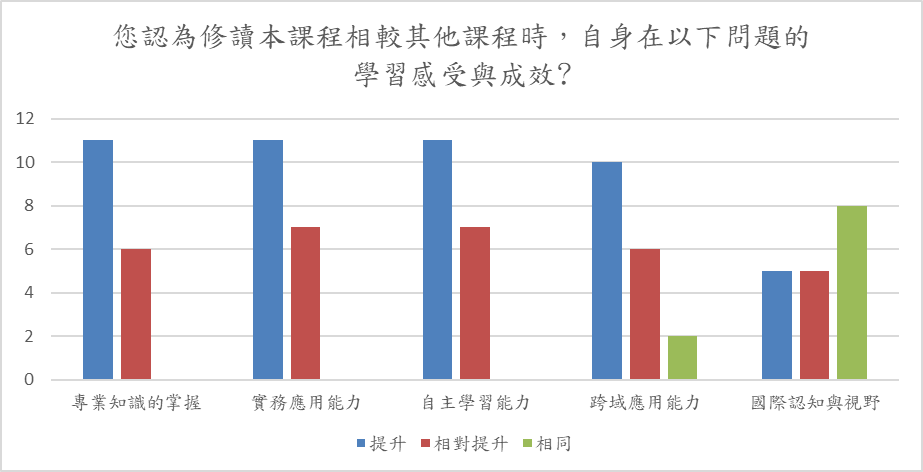 詢問修課生您認為修讀本課程相較其他課程時,自身在以下問題的學習感受與成效,本課程使同學在專業知識的掌握、實務應用能力及自主學習能力有所提升,在國際認知與視野稍弱。