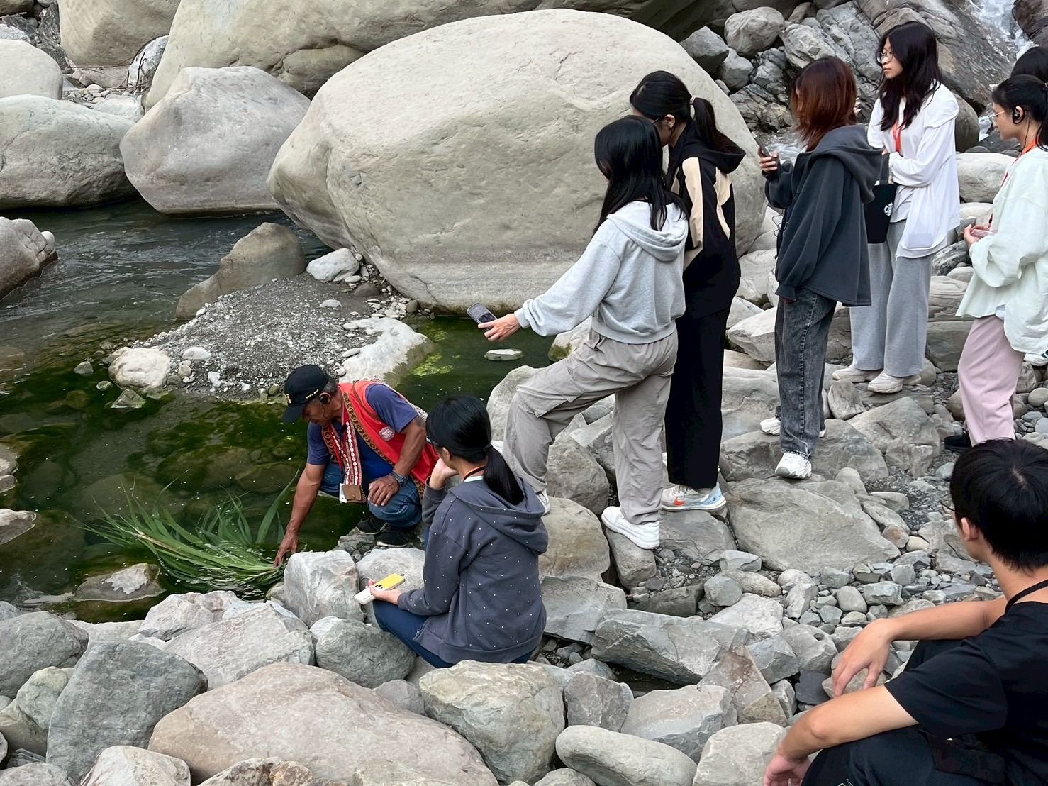 利用大刀將竹子剖面再各分四分竹條,再把竹條鋸到約12 公分的長度。拿出小刀把子竹塊削成竹片,竹片厚度不可一致需由厚到薄,厚度落在0.3-0.1公分。竹片削好後戳洞,用繩子將竹片綁在細竹條上,即可完成。 B. 單音竹笛: 準備一段無節的竹子,先在一端的竹口進行四十五度斜切。在斜切面的短邊邊緣,用小刀往內割出一條細縫,將五節芒的葉子卡入細縫中。把葉子凸出的部分削平,再將五節芒修剪到與斜切面的長邊同長。吹奏時嘴巴含住斜切面,口腔內部不碰觸到葉片,即可發出聲音。 C. 竹炮: 首先,選擇一根較粗的竹子與一根較細的竹子,細竹需能夠剛好塞入粗竹的內部。粗竹必須保留一端的竹節,並將細竹鋸成比粗竹短約一公分的長度。接著,將粗竹的竹節鋸下,並固定在細竹的一端,作為推動時的握把。製作完成後,取濕紙巾或濕衛生紙塞入粗竹內部,用細竹推到底部,讓紙團緊貼竹節處。再放入另一個濕紙團,推至約粗竹中段的位置。最後,快速將細竹推到底部,因壓力瞬間產生,會將前端的濕紙團**「砰!」地一聲從竹炮中發射出去,產生聲響與驚喜效果**,是一種傳統有趣的童玩。 D. 山羌笛: 竹子留一段「節」的位置做為鋸子的切割點,並切割特定長度後建議十五至二十公分,切割為一段閉管,另一段為開管的竹子。將竹子開管部分為起點,用鐮刀切割剖半竹子一半,下方竹子仍連著不切開。分把竹身分為五等份,前五分之一保留不削,後五分之四要削薄竹片兩邊。邊削邊吹直至發出聲音,即完成山羌笛。 四、tohi'u 草束撈魚蝦 依照河川地形與生物習性,運用極簡、卻非常有效的方式進行捕魚蝦。 製作過程: 1. 採集野草,把它們綁成一大束。 2. 直接放進比較平靜、沒那麼湍急的河潭裡。 3. 草束本身就像天然的躲藏處,溪裡的魚跟溪蝦會自己鑽進去躲著。 4. 放上幾天之後,再把草束整束拖到河邊,就可以輕鬆把躲在裡面的魚蝦撿起來。 五、作業內容布達、意見回饋填答、心得分享 | ||||||||