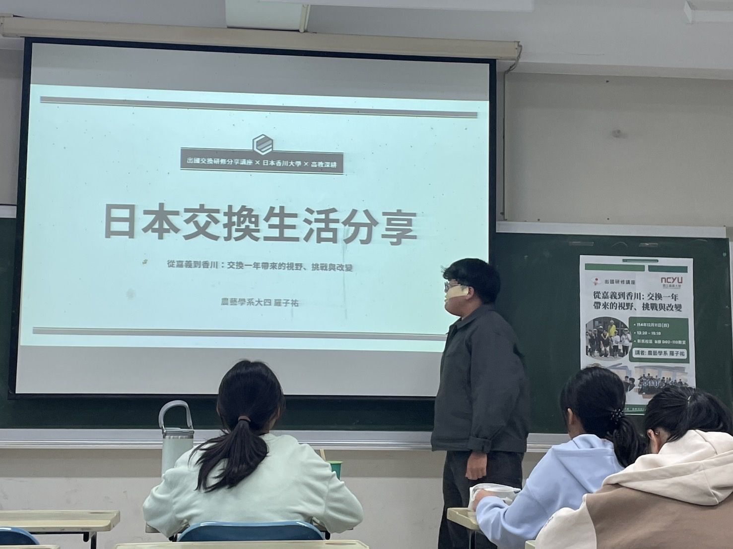 活動內容 | 本次講座由農藝學系大四學生羅子祐擔任講者,在嘉大新民校區舉辦。活動內容圍繞著講者前往日本香川大學進行為期一年交換研修的寶貴經驗。羅同學透過 Google Earth 的實境圖與地理位置圖,引導聽眾認識位於四國的香川縣及校區分布,也詳盡地分享了學術與實作並重的留學生活,特別是「應用生物科學領域倫理」課程,介紹了每週由不同老師授課、強調小組討論以及期末撰寫小論文的扎實訓練。羅同學針對農藝系學生的專業背景,深入展示了在香川大學的「實習」環節,這部分包含果樹、蔬菜、畜產的分組實作,以及親自操作大型農機的難得體驗,除了學術專業,更有豐富的文化沉浸活動,如體驗味噌、碗豆苗製作,甚至是道地的烏龍麵手作課程。整場講座不僅僅是資訊的傳遞,更透過豐富的影像紀錄,展現了從農田勞作到國際交流的多樣化生活面向,讓在場同學對海外交換有了具體且充滿活力的想像。