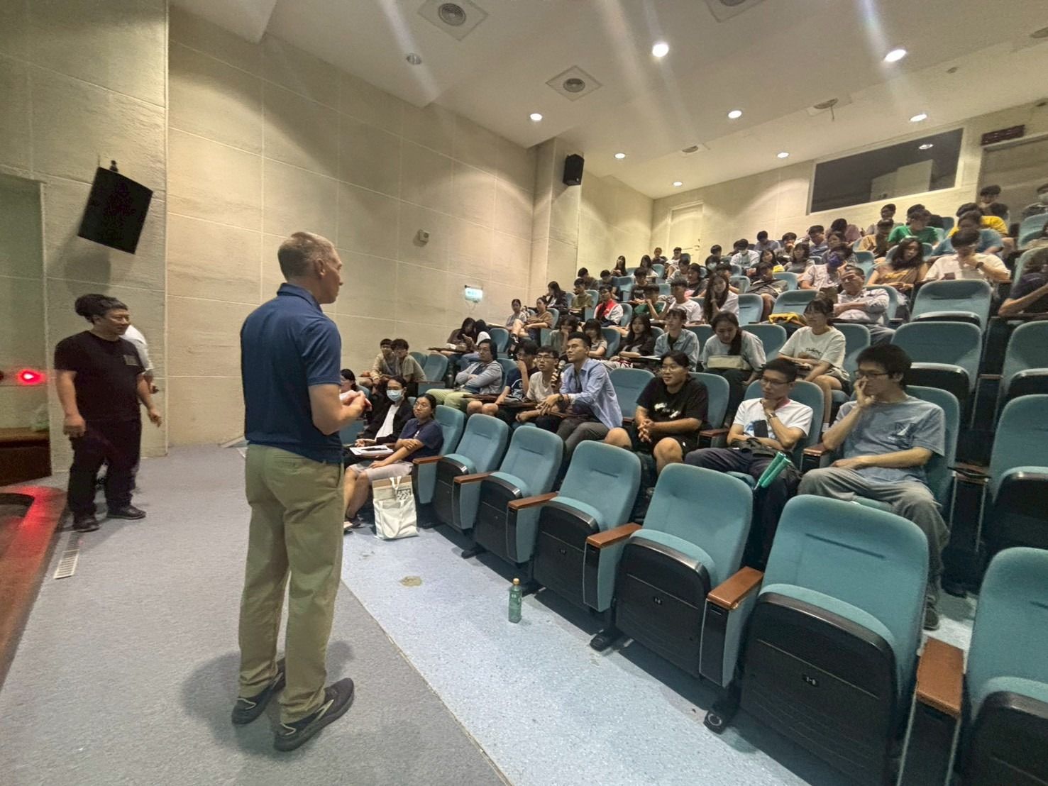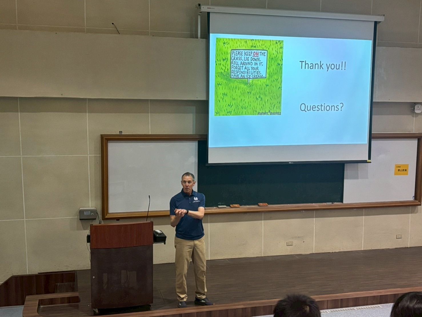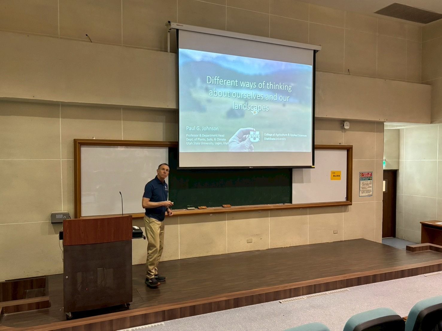 活動內容 | 本場講座特別邀請到美國猶他州立大學植物、土壤與氣候系系主任Paul G. Johnson 教授擔任主講人。講座主題以「Perfection? What does the drive for perfection silence in you?」(完美?對完美的追求讓你失去了什麼?)為核心,探討人類對於景觀美學與自我要求的心理機制。Johnson 教授首先透過「景觀」的視角切入,展示了人類如何試圖將大自然塑造成整齊劃一、完美的模樣,他引導學生們思考,這種對「完美」的執著是否反而壓抑了物種的多樣性與生命的自然本質?更延伸至人的內在,探討「神經多樣性(Neurodiversity)」的議題。他利用投影片分析了基因、環境、以及複雜的神經發育過程,如自閉症、創傷或中風等,如何形塑出不同的思考方式。活動結束後教授也與學生們進行了小規模的圓桌交流會,在輕鬆的氛圍下,學生與教授一邊享用點心,一邊針對學術研究、留學生活以及如何面對職涯壓力進行深度對話,這種結合「大班演講」與「小班座談」的形式,讓學生既能獲得宏觀的知識架構,也能獲得具體的人生建議,打破了傳統學術講座的隔閡感。