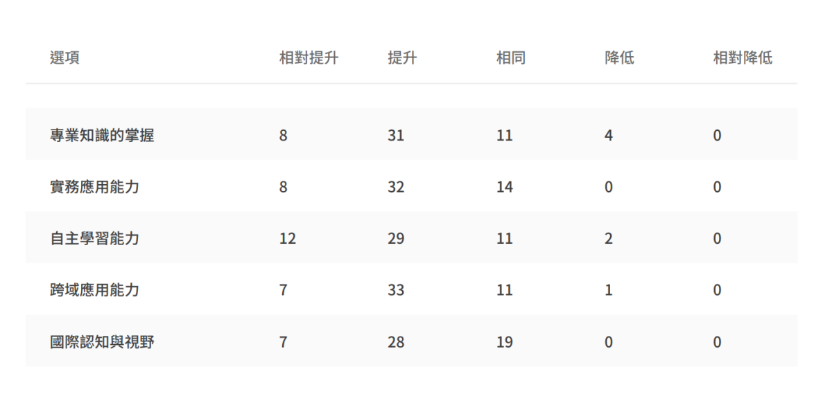 在學生對於自我評估學習成效的回饋中,可分成專業知識的掌握、實務應用能力、自主學習能力、跨域應用能力以及國際認知與視野,以下列點說明: