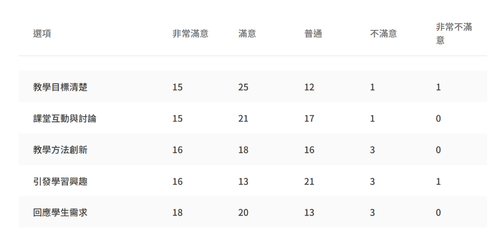 在教師教學方式的回饋中,可分為教學目標是否清楚、課堂互動與討論、教學方法是否創新學生對於課堂教學目標清楚、引法學習興趣以及回應學生需求等5項回饋,以下列點說明: