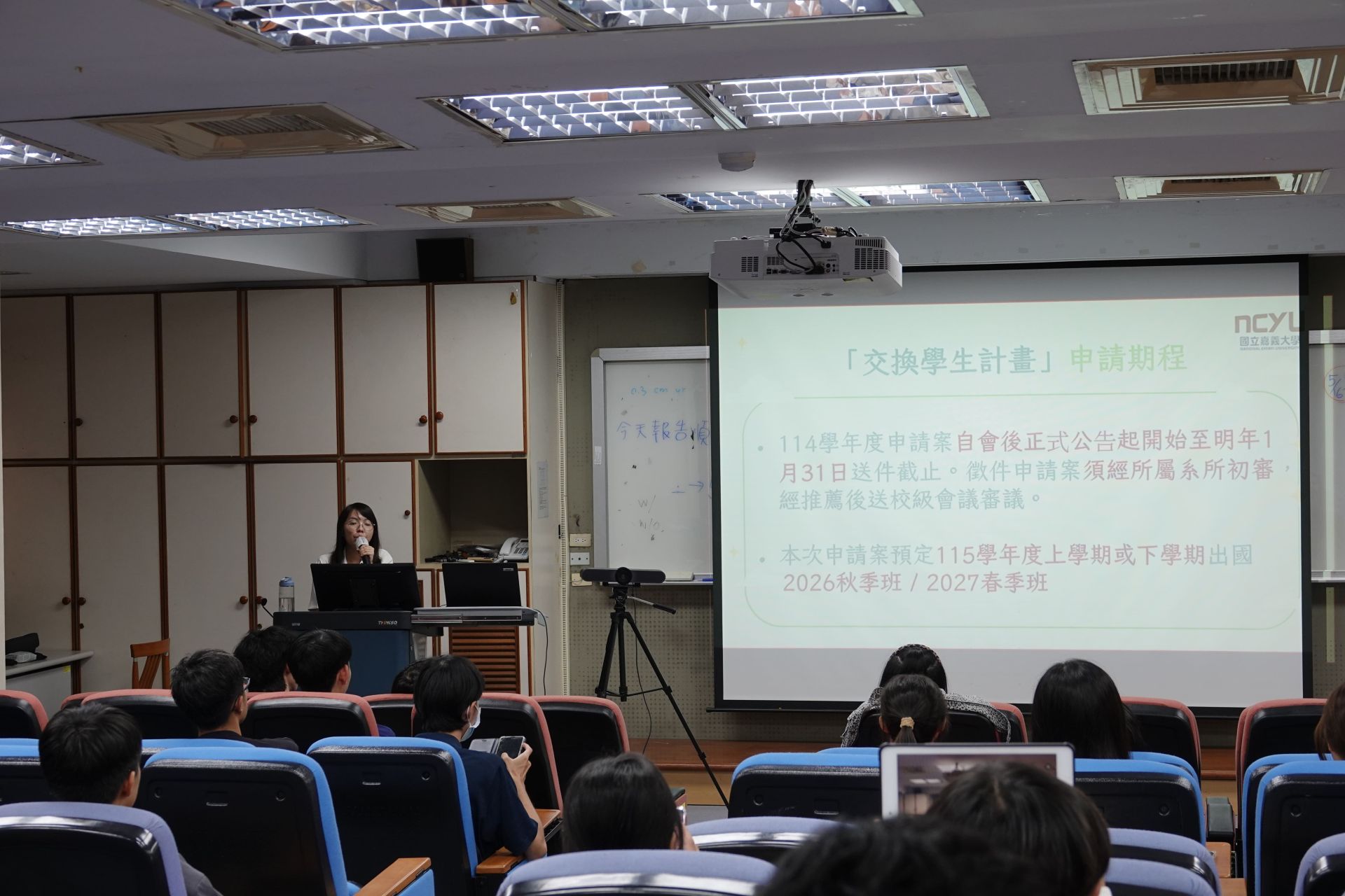 活動內容 | 本次「114學年度交換學生計畫說明會」由國立嘉義大學國際事務處主辦,旨在為校內有意赴國外進修的學生提供權威、詳盡的政策解讀與申請指引。首先,由國際事務長楊正誠進行開場致詞,強調了在全球化浪潮下,具備國際移動力對於當代大學生的重要性,並鼓勵在座同學勇敢踏出舒適圈。說明會的核心內容圍繞著「交換學生計畫」的官方定義展開:校內學生於在學期間前往姊妹校研修一學期至一學年,在不影響原有修課進度且學分可抵免的前提下,修習該校課程,以達到與國際接軌的目的。針對學生最關心的「申請期程」,主講人明確指出 114學年度的申請案自正式公告起開始受理,並於明年1月31日截止,本次說明會特別強調,所有申請案必須先經由所屬系所進行初審,推薦後方能送交校級會議審議,這套嚴謹的篩選機制,確保了出國交換的學生不僅代表個人,更代表學校的學術水準,此外,說明會也規劃了明確的時程表,預計將於115學年度(2026年秋季班或2027年春季班)派送學生出國。透過主講者對申請流程、應備文件、以及學分轉換機制的逐步拆解,使原本複雜的跨國行政流程變得清晰透明,降低了學生的心理門檻。