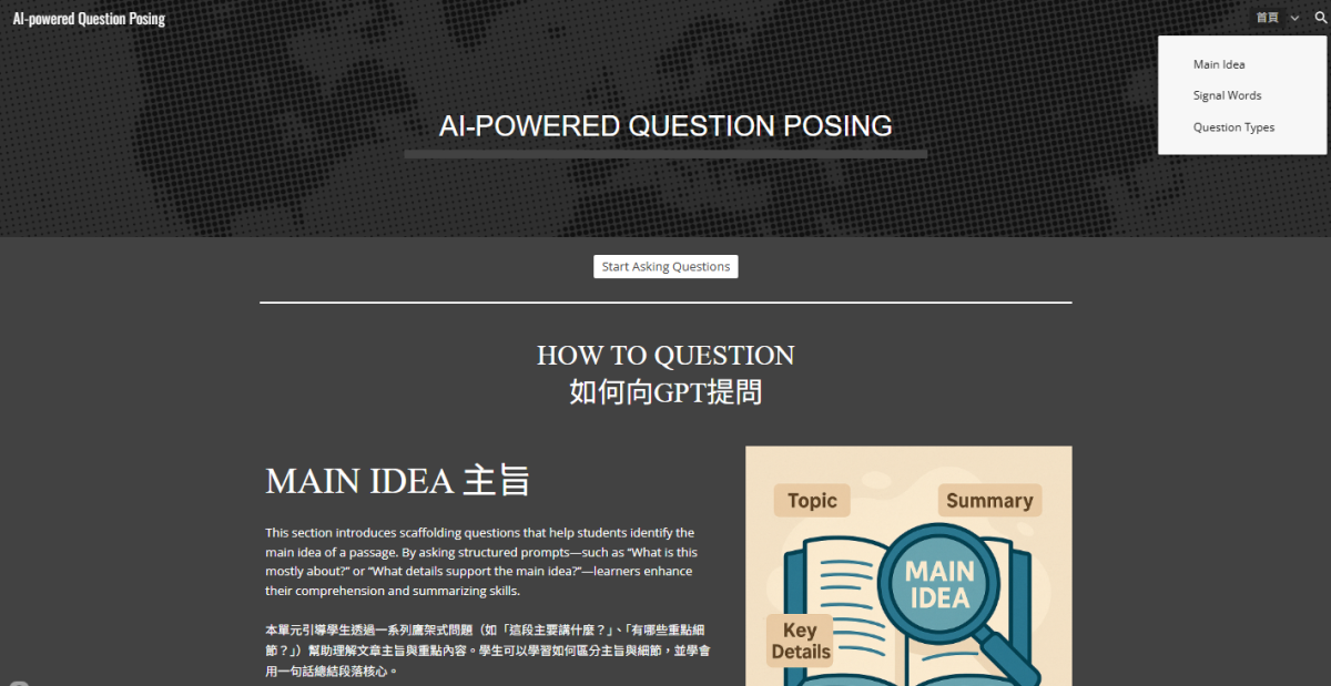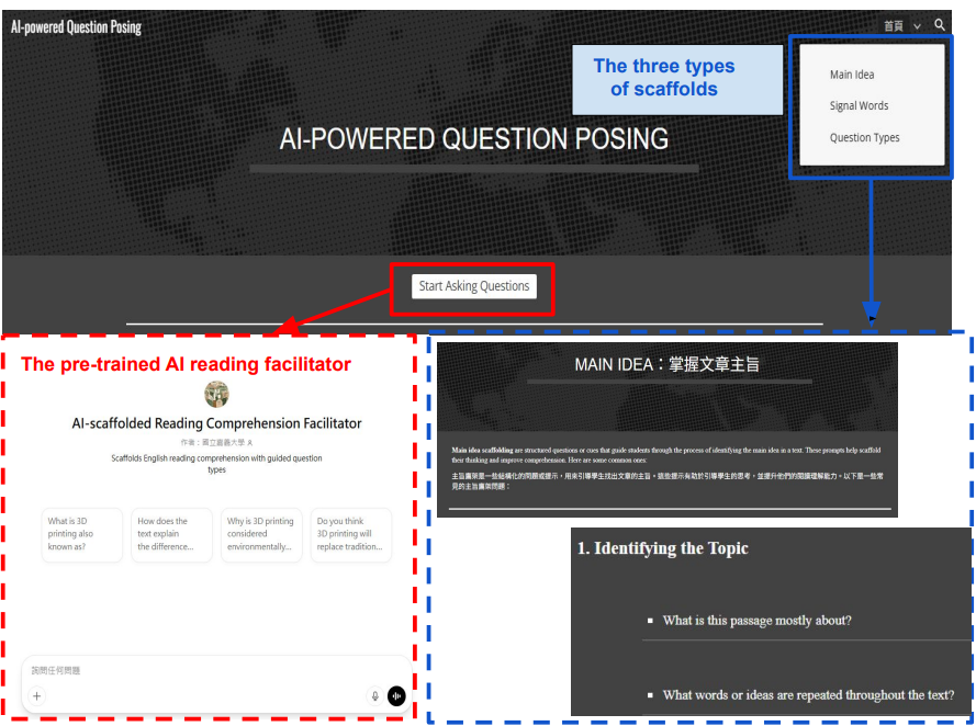 具體措施與 亮點成果 | ★教學研究動機及策略 本課程的教學研究動機,乃在於探索 AI 技術在大學通識英語教學中的實踐價值,並建立一套具可行性與延展性的英語教學模式,期望能作為未來課程創新與教學改進之參考依據。 在數位科技快速發展的背景下,人工智慧已逐漸成為提升學習成效與學習參與度的重要工具。傳統的英文閱讀教學多著重於文本理解與內容回應,學生常處於被動接收知識的角色,學習動機與語言投入程度有限。因此,本課程嘗試導入 AI-supported Question Posing(AI輔助出題系統),結合學生自我提問策略與人工智慧生成技術,培養學生在閱讀過程中主動產出問題的能力,進而提升其閱讀理解、批判思維與學習動機。 在教學策略方面,課程設計以「學生為中心」為原則,結合以下核心策略:(1)以主題式閱讀之課本教材為基礎,引導學生透過 AI 輔助工具針對文章內容提出問題;(2)強調問題的生成、分類與反思歷程,培養學生語言組織與思辨能力;(3)以量化與質性資料進行學習成效評估,檢視學生在閱讀理解、學習動機與學科態度等面向的成長。 | ||||||||||||||||||||||||