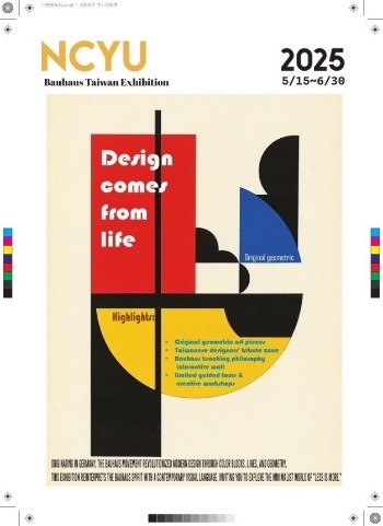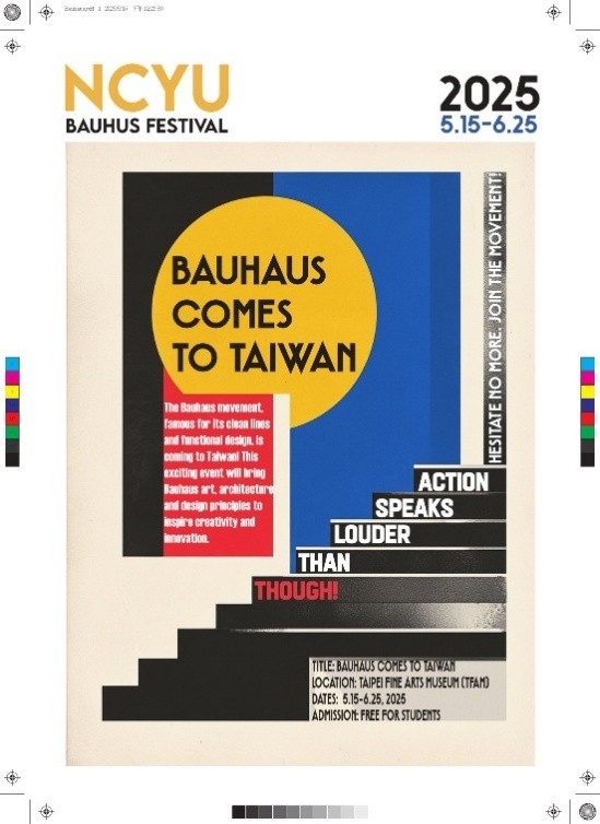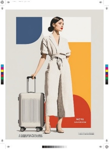 學生使用AI生成作品2 詠唱過程: a modern woman in a minimalist linen outfit, standing with a suitcase, Bauhaus style, geometric abstraction, bold primary colors, clean lines, abstract background, flat shapes, poster design, high contrast, minimal detail,size A4 (portrait). The content should include the text "NCYU" and title: "BAUHAUS MODERNISM", subtitle: "A Celebration of Form and Function".
