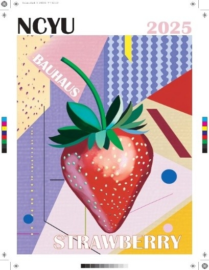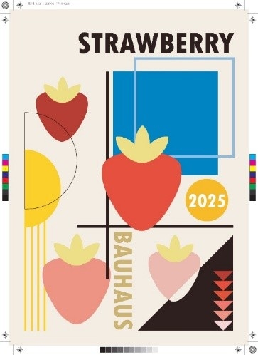 學生使用AI生成作品4 詠唱過程: Bauhaus style strawberry post, geometry Bauhaus style decorate around, bright color background