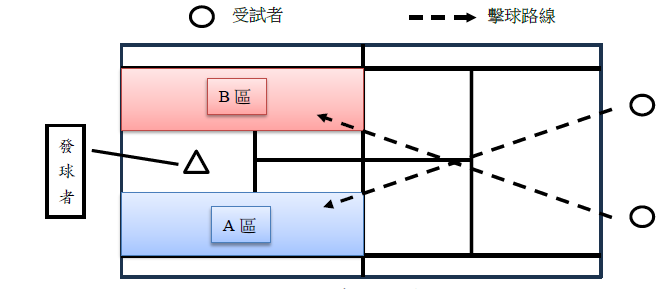 測驗區域場地配置圖 施測方法:本研究之網球技能測驗方法說明依球各項技能測驗落點區分A區與B區,例如:正、反拍著地擊球,各區球數為10球。受試者於測驗前熱身10分鐘,每一項目先行練習5球。惟原測驗採發球機發球,申請人服務學校未購置發球機,故由教師進行送球,若送球位置不佳,受試者(學生)可選擇不揮擊,不算球數。 3.動作技能前後測成效