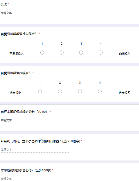 佐證資料 (含活動剪影) | 1. 以Google表單讓學生填寫期末學習心得,內容如下: