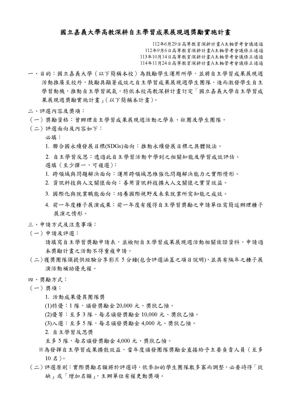 114年更新【法規】國立嘉義大學自主學習成果展現週獎勵實施計畫